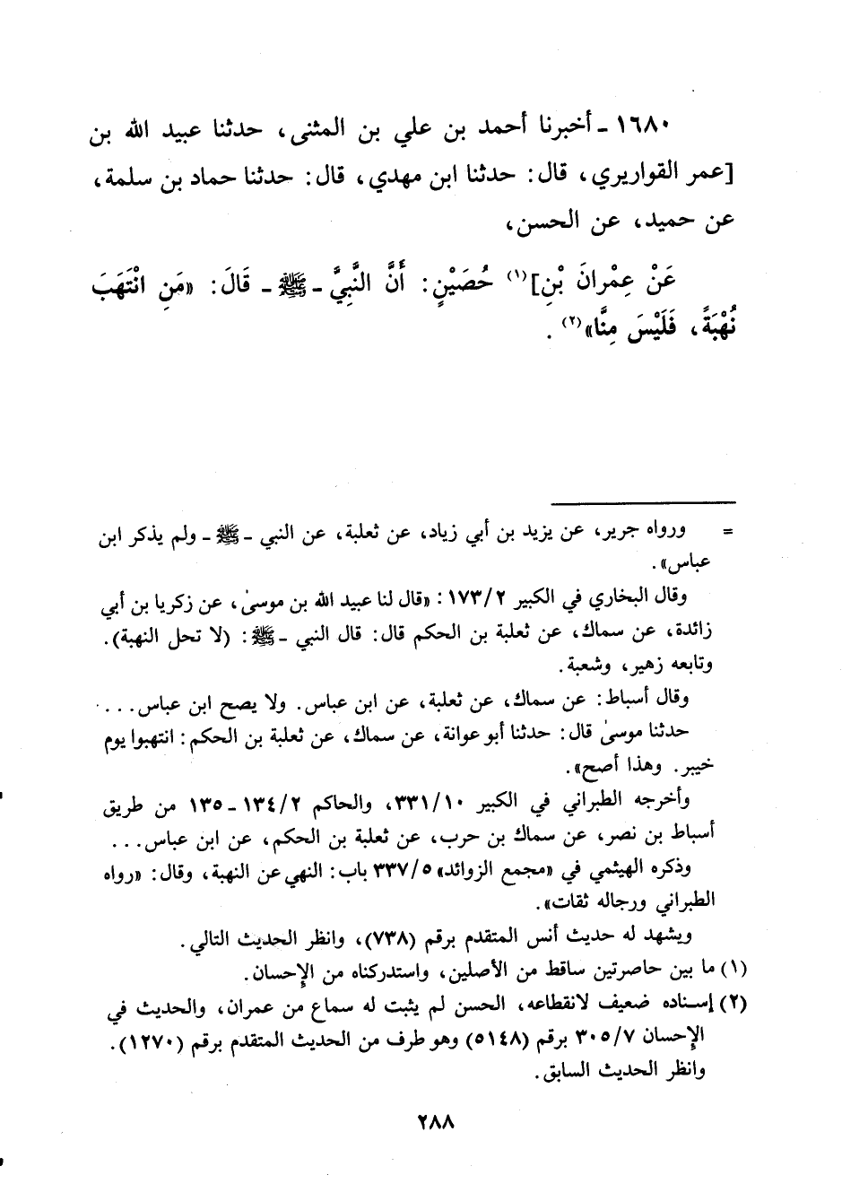 1680 - أخبرنا أحمد بن علي بن المثنى، حدثنا عبيد الله بن [عمر القواريري، قال: حدثنا ابن مهدي، قال: حدثنا حماد بن سلمة، عن حميد، عن الحسن، عَنْ عِمْرانَ بْنِ] (¬1) حُصَيْنٍ: أنَّ النَّبِيّ -صلى الله عليه وسلم- قَالَ: "مَنِ انْتَهَبَ نُهْبَةً، فَلَيْسَ منَّا" (¬2).