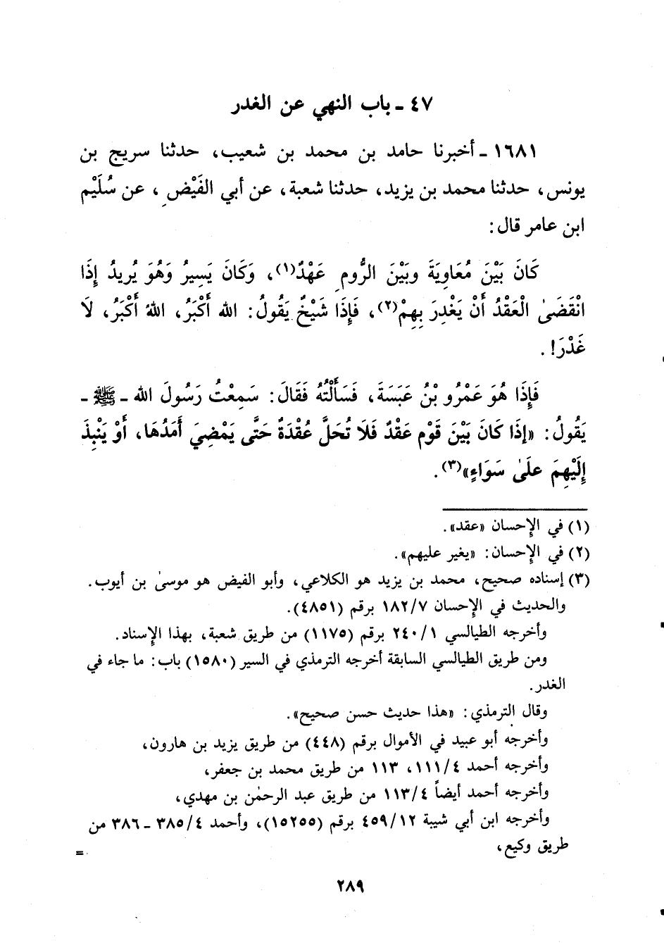 1681 - أخبرنا حامد بن محمد بن شعيب، حدثنا سريج بن يونس، حدثنا محمد بن يزيد، حدثنا شعبة، عن أبي الفَيْضِ، عن سُلَيْم ابن عامر قال: كَانَ بَيْنَ مُعَاوِيةَ وبَيْنَ الرُّومِ عهد (¬1)، وَكَانَ يَسِيرُ وَهُوَ يُريدُ إِذَا انْقَضَى الْعَقْدُ أنْ يَغْدِرَ بِهِمْ (¬2)، فَإِذَا شَيْخٌ يَقُولُ: الله أكْبَرُ، الله أكْبَرُ، لاَ غَدْرَ!. فَإِذَا هُوَ عَمْرُو بْنُ عَبَسَةَ، فَسَألْتُهُ فَقَالَ: سَمِعْتُ رسول الله -صلى الله عليه وسلم- يَقُولُ: "إذَا كَانَ بَيْنَ قَوْم عَقْدٌ فلا تُحَلَّ عُقْدَةٌ حَتَّى يَمْضِيَ أَمَدُهَا، أوْ يَنْبِذَ إِلَيْهِمَ علَى سَوَاءٍ" (¬3).