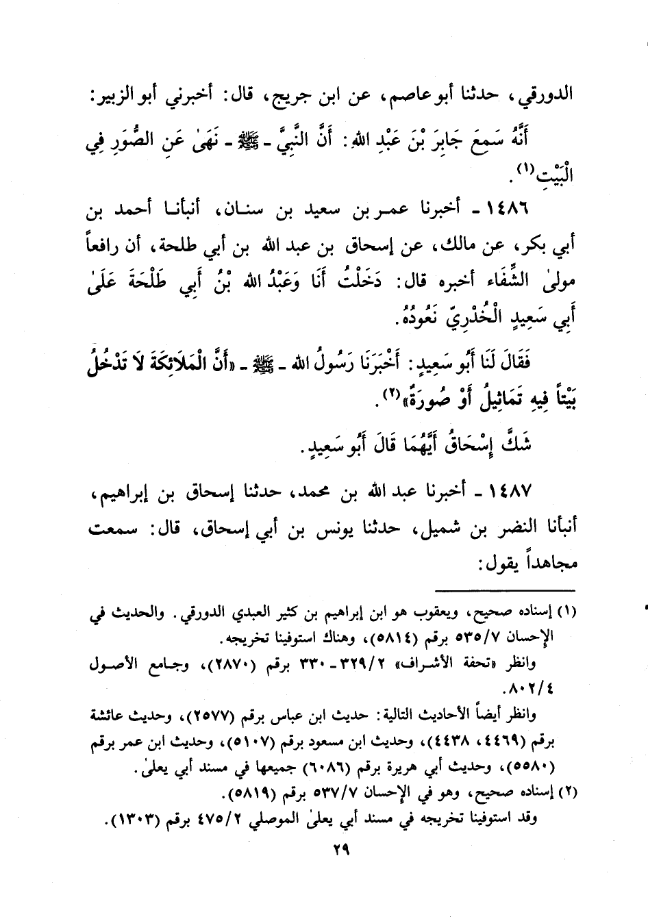 1486 - أخبرنا عمر بن سعيد بن سنان، أنبأنا أحمد بن أبي بكر، عن مالك، عن إسحاق بن عبد الله بن أبي طلحة، أن رافعاً مولى الشِّفَاء أخبره قال: دَخَلْتُ أَنَا وَعَبْدُ الله بْنُ أَبِي طَلْحَةَ عَلَى أَبِي سَعِيدٍ الْخُدْرِى نَعُودُهُ. فَقَالَ لَنَا أَبُو سَعِيدٍ: أَخْبَرَنَا رَسُولُ الله -صلى الله عليه وسلم- "أَنَّ الْمَلائِكَةَ لا تَدْخُلُ بَيْتاً فِيهِ تَمَاثِيلُ أَوْصورَة" (¬2). شَكَّ إِسْحَاقُ أيهما قَالَ أَبُو سَعِيدٍ.