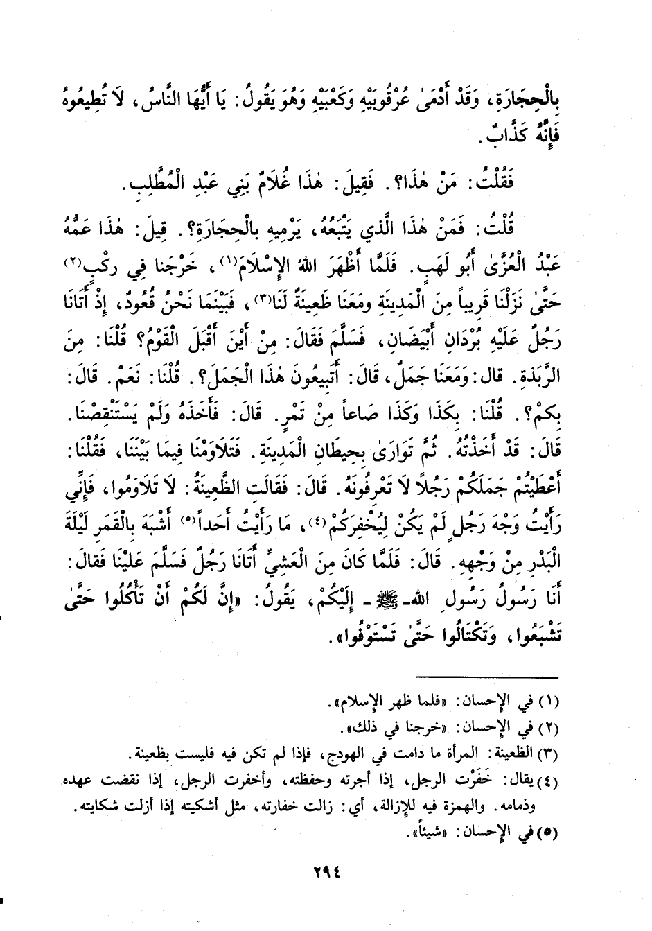 بِالْحِجَارَةِ، وَقَدْ أدْمَى عُرْقُوَبيْهِ وَكَعْبَيْهِ وَهُوَ يَقُولُ: يَا أيُّها الناسُ، لاَ تُطِيعُوهُ فَإِنَّهُ كَذَّابٌ. فَقُلْتُ: مَنْ هذَا؟. فَقِيلَ: هذَا غُلامٌ بَنِي عَبْدِ الْمُطَّلِبِ. قُلْتُ: فَمَنْ هذَا الذي يَتْبَعُهُ، يَرْمِيهِ بالْحِجَارَةِ؟. قِيلَ: هذَا عَمُّهُ عَبْدُ الْعُزَّى أبُو لَهَبٍ. فَلَمَّا أظْهَرَ الله الإسْلامَ (¬1)، خَرْجَنا فِي ركْبِ (¬2) حَتى نَزَلْنَا قَرِيباً مِنَ الْمَدِينَةِ ومَعَنَا ظَعِينَةٌ لَنَا (¬3)، فَبَيْنَمَا نَحْنُ قُعُودٌ، إِذْ أتَانَا رَجُلٌ عَلَيْهِ بُرْدَانِ أبْيَضَانِ، فَسَلّمَ فَقَالَ: مِنْ أيْنَ أقْبَلَ الْقَوْمُ؟ قُلْنَا: مِنَ الربَذةِ. قال: وَمَعَنَا جَمَلٌ، قَالَ: أتَبِيعُونَ هذَا الْجَمَلَ؟. قُلْنَا: نَعَمْ. قَالَ: بِكمْ؟. قُلْنَا: بِكَذَا وَكَذَا صَاعاً مِنْ تَمْرٍ. قَالَ: فَأخَذَهُ وَلَمْ يَسْتَنْقِصْنَا. قَالَ: قَدْ أخَذْتُهُ. ثُمّ تَوَارَى بِحِيطَانِ الْمَدِينَةِ. فَتَلاوَمْنَا فِيمَا بَيْنَنَا، فَقُلْنَا: أعْطَيْتُمْ جَمَلَكُمْ رَجُلاً لا تَعْرِفُونَهُ. قَالَ: فَقَالَتِ الظَّعِينَةُ: لا تَلاوَمُوا، فَإِنَّي رَأيْتُ وَجْهَ رَجُلٍ لَمْ يَكُنْ لِيُخْفِرَكُمْ (¬4)، مَا رَأيْتُ أحَداً (¬5) أشْبَهَ بِالْقَمَرِ لَيْلَةَ الْبَدْرِ مِنْ وَجْهِهِ. قَالَ: فَلَمَّا كَانَ مِنَ الْعَشِيِّ أتَانَا رَجُلٌ فَسَلَّمَ عَليْنَا فَقالَ: أَنَا رَسُولُ رَسُولِ الله -صلى الله عليه وسلم- إلَيْكُمْ، يَقُولُ: "إِنَّ لَكُمْ أنْ تَأكُلُوا حَتَّى تَشْبَعُوا، وَتَكْتَالُوا حَتَّى تَسْتَوْفُوا".