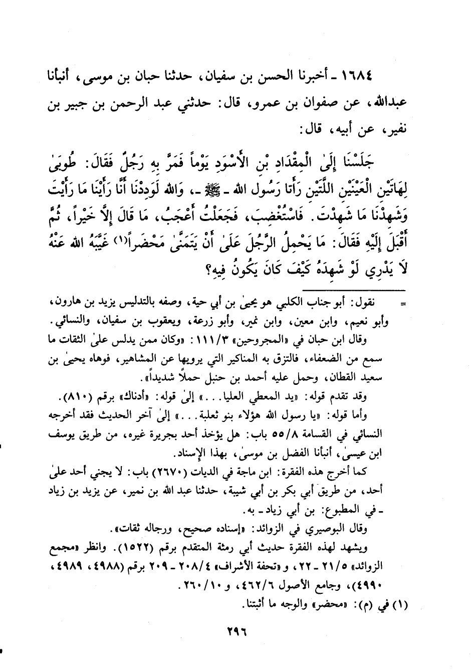 1684 - أخبرنا الحسن بن سفيان، حدثنا حبان بن موسى، أنبأنا عبد الله، عن صفوان بن عمرو، قال: حدثني عبد الرحمن بن جبير بن نفير، عن أبيه، قال: جَلَسْنَا إِلَى الْمِقْدَادِ بْنِ الأسْوَدِ يَوْماً فَمَرَّ بِهِ رَجُلٌ فَقَالَ: طُوبَى لِهَاتَيْنِ الْعَيْنَيْنِ اللَّتين رَأتا رَسُول الله -صلى الله عليه وسلم-، وَالله لَوَدِدْنَا أنَّا رَأَيْنَا مَا رَأيْتَ وَشَهِدْنَا مَا شَهِدْتَ. فَاسْتُغْضِبَ، فَجَعَلْتُ أعْجَبُ، مَا قَالَ إلا خَيْراً، ثُمَّ أقْبَلَ إِلَيْهِ فَقَالَ: مَا يَحْمِلُ الرَّجُلَ عَلَى أنْ يَتَمَنَّى مَحْضَراً (¬1) غَيَّبَهُ الله عَنْهُ لاَ يَدْرِي لَوْ شَهِدَهُ كَيْفَ كَانَ يَكُونُ فِيهِ؟