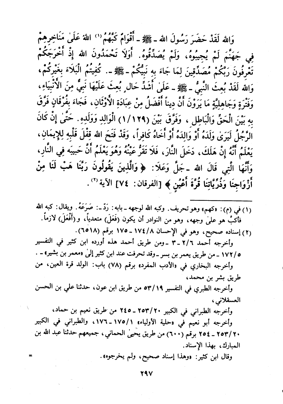 وَالله لَقَدْ حَضَرَ رَسُولَ الله -صلى الله عليه وسلم- أقْوَامٌ كبَّهُمُ (¬1) الله عَلَى مَنَاخِرِهِمْ فِي جَهَنَّمَ لَمْ يُجِيبُوهُ، وَلَمْ يُصَدِّقُوُه. أوَلا تَحْمَدُونَ الله إِذْ أخْرَجَكُمْ تَعْرِفُونَ ربَّكُمْ مُصَدِّقِينَ لِمَا جَاءَ بِهِ نَبِيُّكُمْ -صلى الله عليه وسلم-. كُفِيتُمُ الْبَلاءَ بِغَيْرِكُمْ، وَالله لَقَدْ بُعِثَ النبِيُّ -صلى الله عليه وسلم- عَلَى أشَدِّ حَالٍ بُعِثَ عَلَيْهَا نبِي مِنَ الأنْبِيَاءِ، وَفَتْرَةٍ وجاهليَّة مَا يَرَوْنَ أنَّ دِيناً أفْضَلُ مِنْ عِبَادَةِ الأوْثَانِ، فَجَاءَ بِفُرْقَانٍ فرَّقَ بِهِ بَيْنَ الْحَق وَالْبَاطِلِ، وَفَرقَ بَيْنَ (129/ 1) الْوَالِدِ وَوَلَدِهِ. حَتَّى إنْ كَانَ الرَّجُلُ لَيَرَى وَلَدَهُ أوْ وَالِدَه ُ أوْ أخَاهُ كَافِراً، وَقَدْ فَتَحَ الله قِفْلَ قَلْبِهِ لِلإيمَانِ، يَعْلَمُ أنَّهُ إنْ هَلَكَ، دَخَلَ النَّارَ، فَلا تقر عَيْنُهُ وَهُوَ يَعْلَمُ أنَ حَبيبَه فِي النَّارِ، وَأنَّهَا الّتِي قَالَ الله -جَل وَعَلا: {وَالَّذِينَ يَقُولُونَ رَبَّنَا هَبْ لَنَا مِنْ أَزْوَاجِنَا وَذُرِّيَّاتِنَا قُرَّةَ أَعْيُنٍ} [الفرقان: 74] الآية (¬2).
