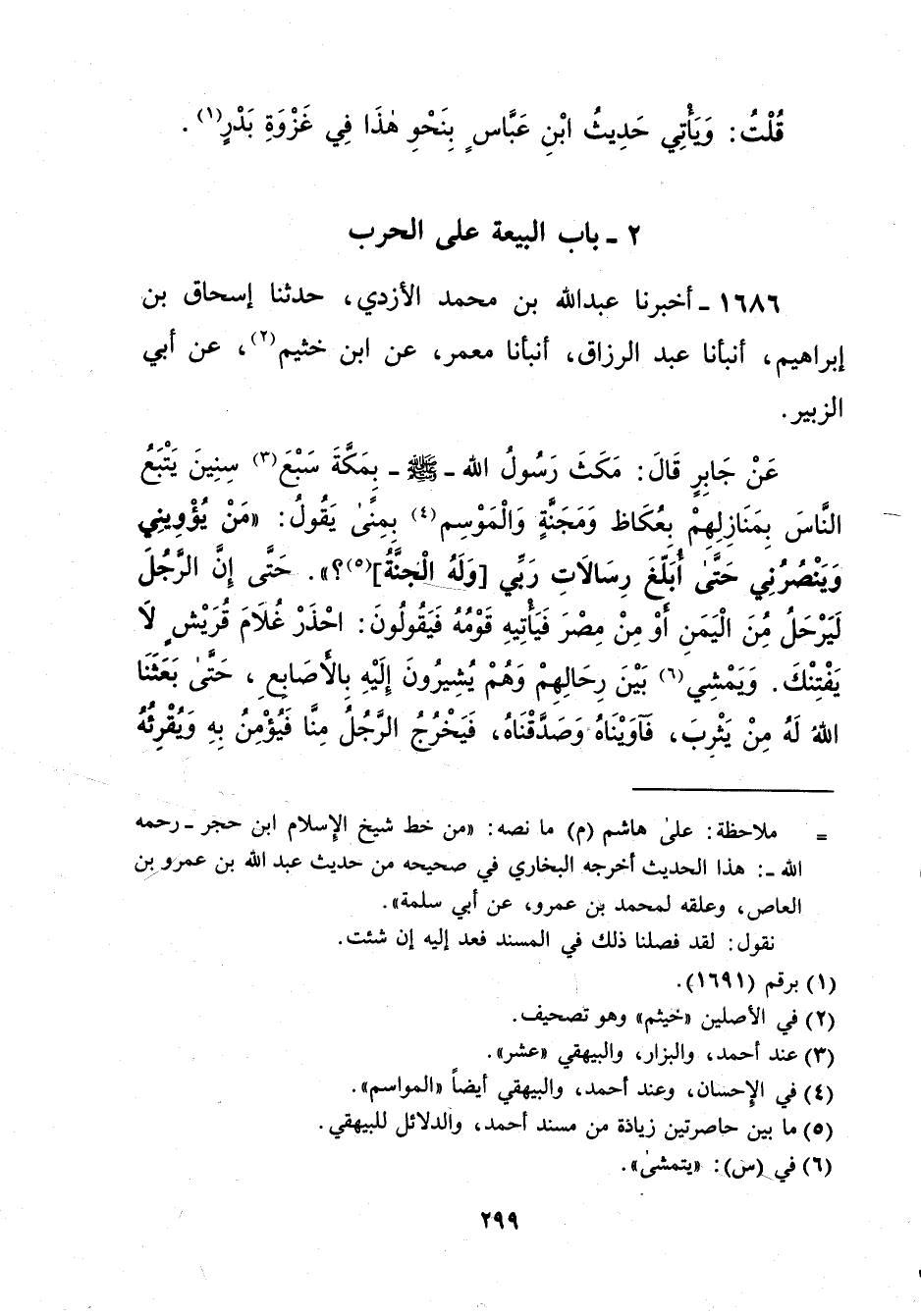 1686 - أخبرنا عبد الله بن محمد الأزدي، حدثنا إسحاق بن إبراهيم، أنبأنا عبد الرزاق، أنبأنا معمر، عن ابن خثيم (¬2)، عن أبي الزبير. عَنْ جَابِرٍ قَالَ: مَكَثَ رَسُولُ الله -صلى الله عليه وسلم- بِمَكَّةَ سَبْعَ (¬3) سِنِينَ يَتْبَعُ النَّاسَ بِمَنَازِلِهِمْ بعُكَاظ وَمَجَنَّةٍ وَالْمَوْسِم (¬4) بِمِنًى يَقُولُ: "مَنْ يُؤوينِي وَيَنْصُرُنِي حَتَّى أُبَلّغَ رِسَالاتِ رَبِّي [وَلَهُ الجنَّة] (¬5)؟ ". حَتَّى إِنَّ الرَّجُلَ لَيَرْحَلُ مُنَ الْيَمَنِ أوْ مِنْ مِصْرَ فَيَأْتِيهِ قَوْمُهُ فَيَقُولُونَ: احْذَرْ غُلامَ قُريْش لا يَفْتِنْكَ. وَيمْشِي (¬6) بَيْنَ رِحَالِهِمْ وَهُمْ يُشِيرُونَ إِلَيْهِ بِالأصَابع، حَتَّى بَعَثَنَا اللهُ لَهُ مِنْ يَثْربَ، فآوَينَاهُ وَصَدَّقْنَاهُ، فَيَخْرُجُ الرَّجُلُ مِنَّا فيُؤْمِنُ بِهِ وَيُقْرِئُهُ
