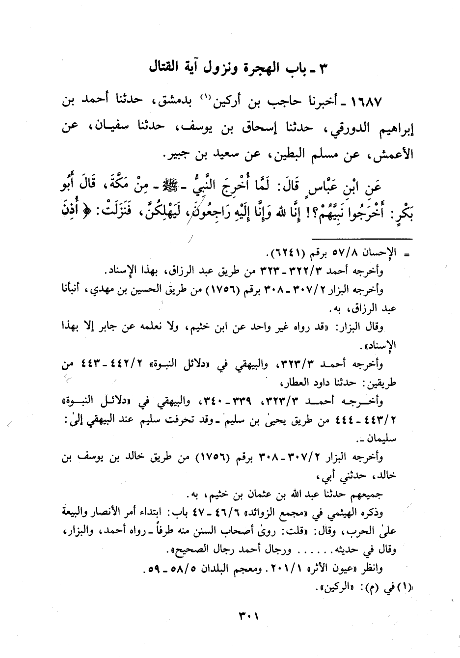 1687 - أخبرنا حاجب بن أركين (¬1) بدمشق، حدثنا أحمد بن إبراهيم الدورقي، حدثنا إسحاق بن يوسف، حدثنا سفيان، عن الأعمش، عن مسلم البطين، عن سعيد بن جبير. عَنِ ابْنِ عَبَّاسٍ قَالَ: لَمَّا أَخْرِجَ النَّبيُّ -صلى الله عليه وسلم- مِنْ مَكَّةَ، قَالَ أَبُو بَكْرٍ: أَخْرَجُوا نَبِيَّهُمْ؟! إنَّا لله وَإِنَّا إِلَيْهِ رَاجِعُوَن، لَيَهْلِكُنَّ، فَنَزَلَتْ: {أُذِنَ