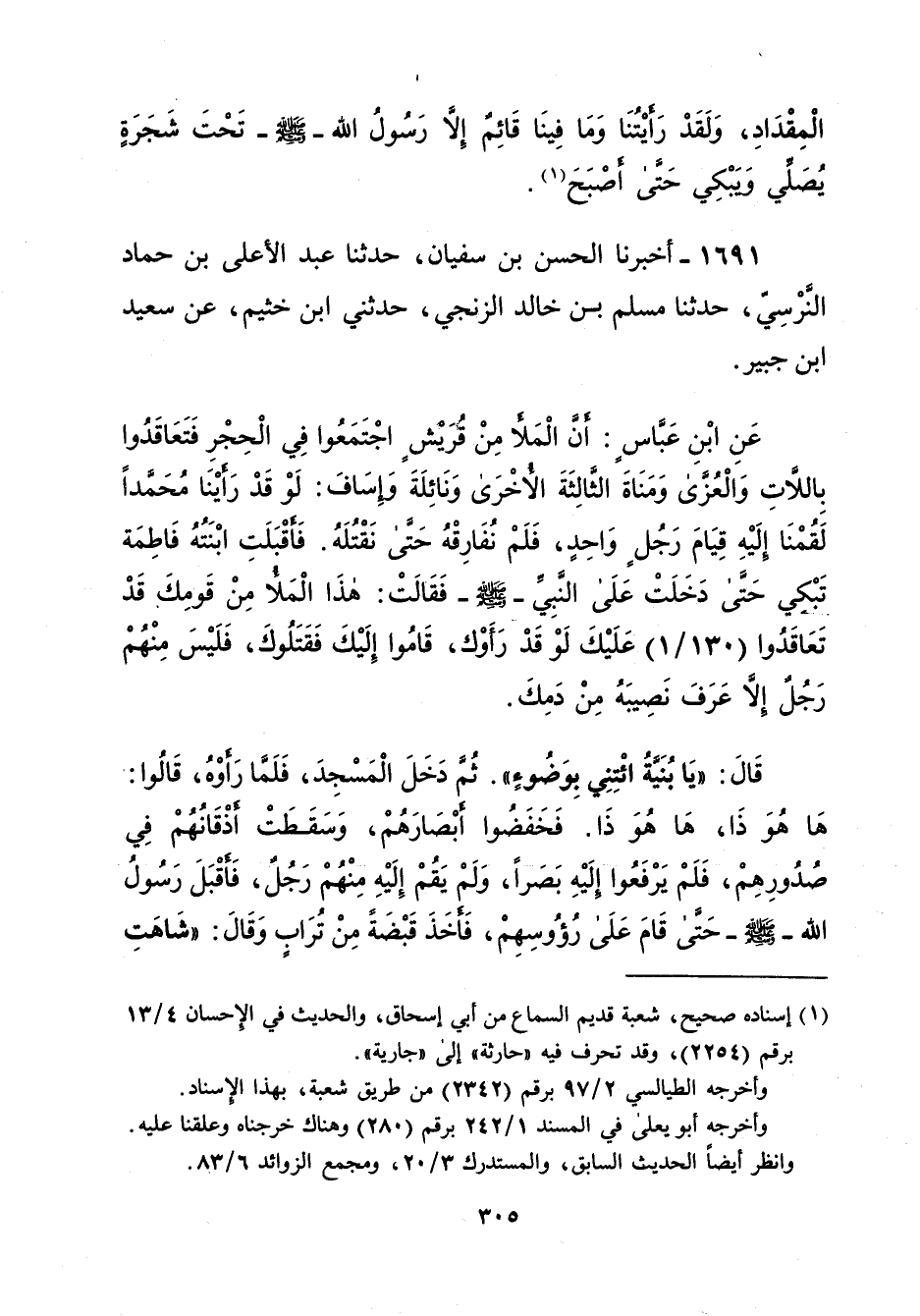 1691 - أخبرنا الحسن بن سفيان، حدثنا عبد الأعلى بن حماد النَّرْسِيّ، حدثنا مسلم بن خالد الزنجي، حدثني ابن خثيم، عن سعيد ابن جبير. عَنِ ابْنِ عَبَّاسٍ: أنَّ الْمَلأ مِنْ قريش اجْتَمَعُوا فِي الْحِجْرِ فَتَعَاقَدُوا بِاللاَّتِ وَالْعُزَّى وَمَنَاةَ الثَّالِثَةَ الأخْرَى وَنَائِلَةَ وإِسَافَ: لَوْ قَدْ رَأيْنَا مُحَمَّداً لَقُمْنَا إلَيْهِ قِيَامَ رَجُلٍ وَاحِدٍ، فَلَمْ نُفَارِقْهُ حَتَّى نَقْتُلَهُ. فَأقْبَلَتِ ابْنَتُهُ فَاطِمَة تبكى حَتَّى دَخَلَتْ عَلَى النَّبِيِّ -صلى الله عليه وسلم- فَقَالَتْ: هذَا الْمَلأُ مِنْ قَومِك قَدْ تَعَاقَدُوا (130/ 1) عَلَيْكَ لَوْ قَدْ رَأَوْك، قَامُوا إِلَيْكَ فَقَتَلُوكَ، فَلَيْسَ مِنْهُمْ رَجُلٌ إلاَّ عَرَفَ نَصِيبَهُ مِنْ دَمِكَ. قَالَ:" يَا بُنَيَّةُ ائْتِنى بوضوءٍ". ثُمَّ دَخَلَ الْمَسْجِدَ، فَلَمَّا رَأوْهُ، قَالُوا: هَا هُوَ ذَا، هَا هُوَ ذَا. فَخَفَضُوا أبْصَارَهُمْ، وَسَقَطَتْ أذْقَانُهُمْ فِي صُدُورِهِمْ، فَلَمْ يَرْفَعُوا إلَيْهِ بَصَراً، وَلَمْ يَقُمْ إِلَيْهِ مِنْهُمْ رَجُلٌ، فَأقْبَلَ رَسُولُ الله -صلى الله عليه وسلم- حَتَّى قَامَ عَلَى رُؤُوسِهِمْ، فَأخَذَ قَبْضَةً مِنْ تُرَابٍ وَقَالَ: "شَاهَتِ