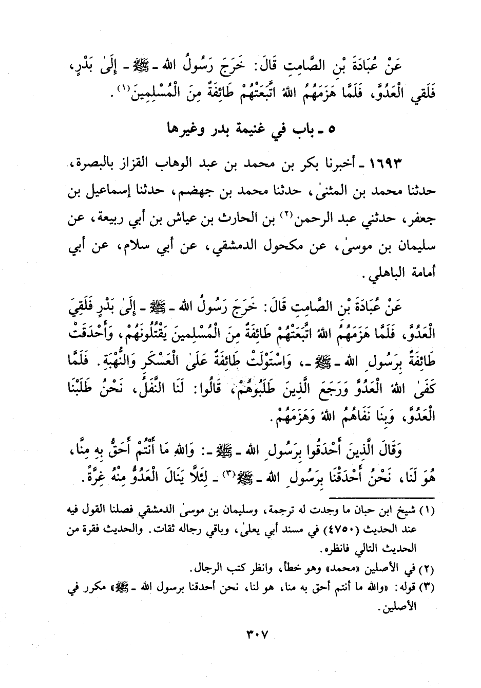 عَنْ عُبَادَةَ بْنِ الصَّامِتِ قَالَ: خَرَجَ رَسُولُ الله -صلى الله عليه وسلم- إِلَى بَدْرٍ، فَلَقي الْعَدُوَّ، فَلَمَّا هَزَمَهُمُ الله اتَّبَعَتْهُمْ طَائِفَةٌ مِنَ الْمُسْلِمِينَ (¬1).