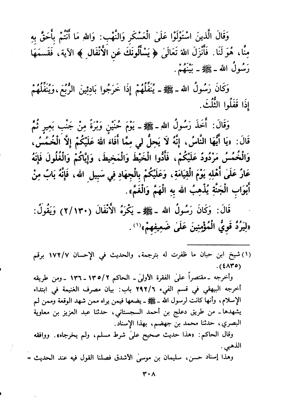 وَقَالَ الَّذين اسْتَوْلَوْا عَلَى الْعَسْكَرِ وَالنَّهْبِ: وَاللهِ مَا أنْتُمْ بِأَحَقَّ بِهِ مِنَّا، هُوَ لَنَا. فَأنْزَلَ اللهُ تَعَالَى {يَسْأَلُونَكَ عَنِ الْأَنْفَالِ} الآية، فَقَسمَهَا رَسُولُ الله -صلى الله عليه وسلم- بَيْنَهُمْ. وَكَانَ رَسُولُ الله -صلى الله عليه وسلم- يُنَفَّلُهُمْ إِذَا خَرَجُوا بَادِئِينَ الرُّبُعَ، وُينَفَّلُهُمْ إِذَا قَفَلُوا الثُّلُثَ. وَقَالَ: أخَذَ رَسُولُ اللهِ -صلى الله عليه وسلم- يَوْمَ حُنَيْنٍ وَبْرَةً مِنْ جَنْب بَعِيرٍ ثُمَّ قَالَ: "يَا أيُّها النَّاسُ، إنَّه لا يَحِلُّ لي مِمَّا أفَاءَ اللهُ عَلَيْكُمْ إِلاَّ الْخُمُسُ، وَالْخُمُسُ مَرْدُودٌ عَلَيْكمْ، فَأدُّوا الْخَيْطَ وَالْمَخِيطَ، وإيَّاكُمْ وَالغُلُولَ فَإِنهُ عَارٌ عَلَى أهْلِهِ يَوْمَ الْقِيَامَةِ، وَعَلَيْكُمْ بِالْجِهَادِ فِي سَبِيلِ الله، فَإِنّهُ بَابٌ مِنْ أبْوَابِ الْجَنّةِ يُذْهِبُ الله بِهِ الْهَمَّ وَالْغَمَّ". قَالَ: وَكَانَ رَسُولُ الله -صلى الله عليه وسلم- يَكْرَهُ الأنْفَالَ (130/ 2) وَيقُولُ: "لِيَرُدَّ قَوِي الْمُؤْمنِينَ عَلَى ضَعِيفِهِمْ" (¬1).