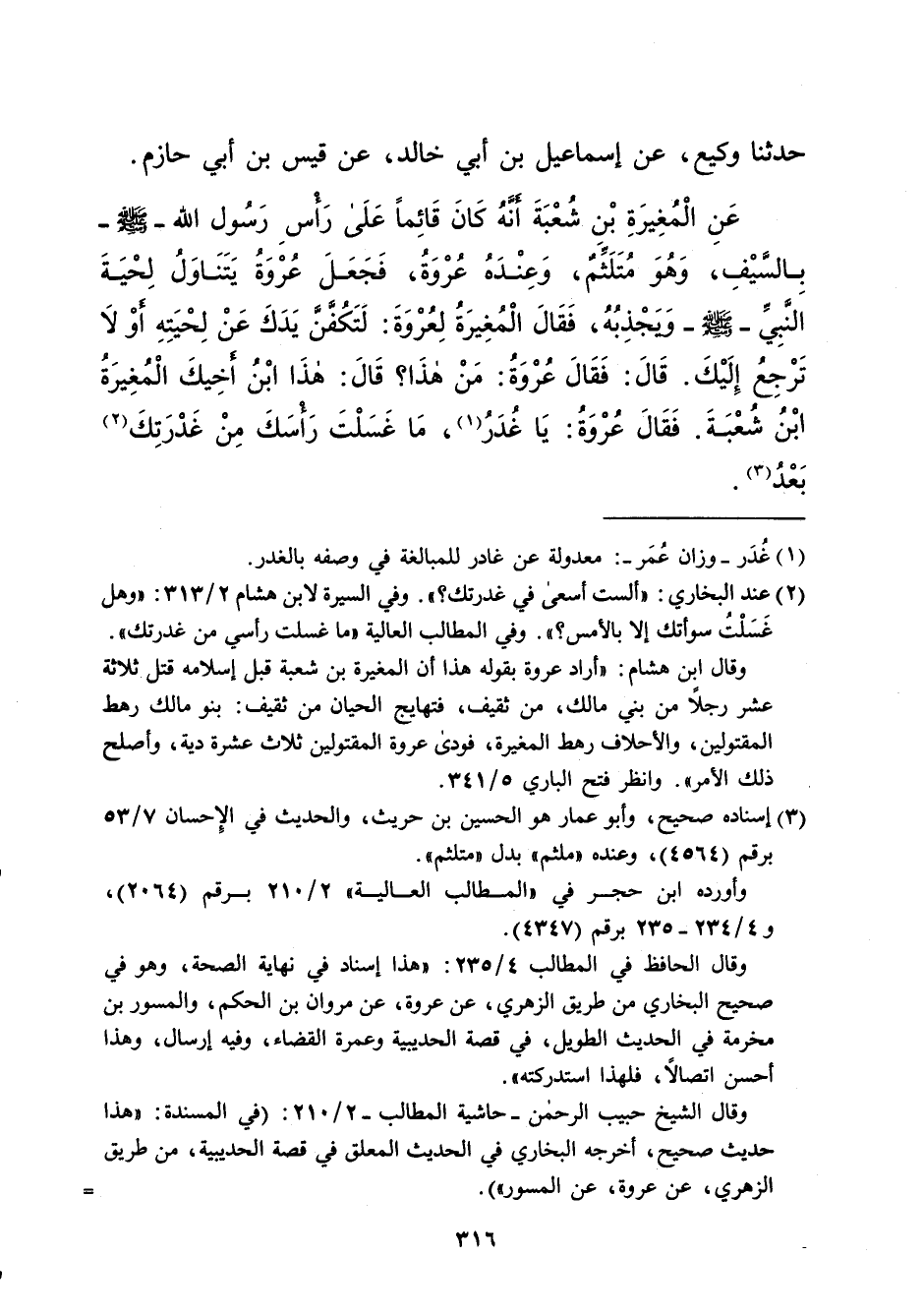 عَنِ الْمُغِيرَةِ بْن شُعْبَةَ أنَّهُ كَانَ قَائِماً عَلَى رَأْسِ رَسُول الله -صلى الله عليه وسلم- بِالسَّيْفِ، وَهُوَ مُتَلَثِّمٌ، وَعِنْدَهُ عُرْوَةُ، فَجَعَلَ عُرْوَةُ يَتَنَاوَلُ لحيةَ النَّبِيِّ -صلى الله عليه وسلم-وَيجْذِبُهُ، فَقَالَ الْمُغِيرَةُ لِعُرْوَةَ: لَتَكُفَّنَّ يَدَكَ عَنْ لِحْيَتِهِ أوْ لا تَرْجِعُ إِلَيْكَ. قَالَ: فَقَالَ عُرْوَةُ: مَنْ هذَا؟ قَالَ: هذَا ابْنُ أخِيكَ الْمُغِيرَةُ ابْنُ شُعْبَةَ. فَقَالَ عُرْوَةُ: يَا غُدَرُ (¬1)، مَا غَسَلْتَ رَأْسَكَ مِنْ غَدْرَتِكَ (¬2) بَعْدُ (¬3).