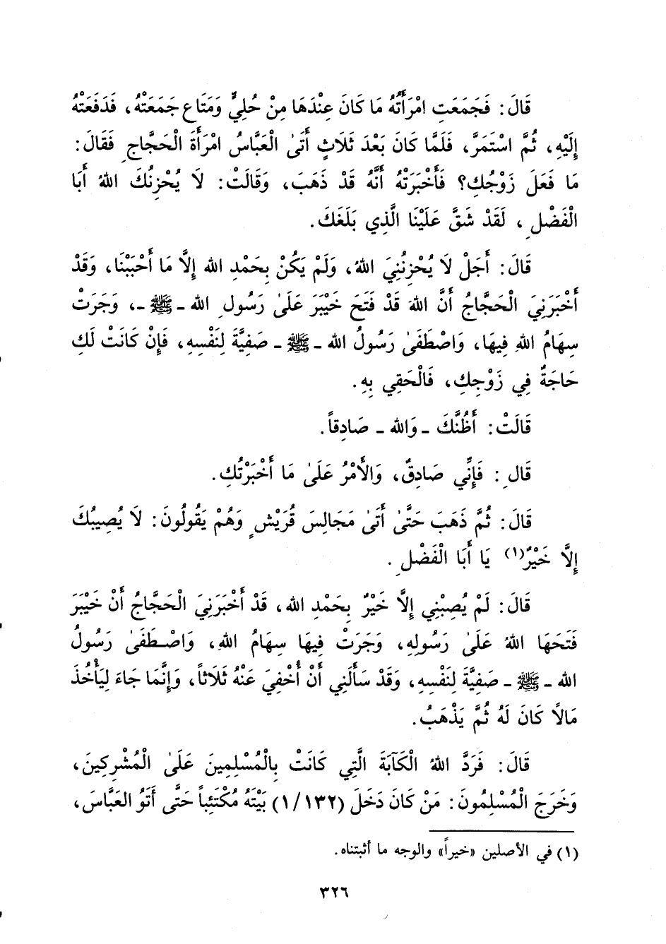قَالَ: فَجَمَعَتِ أمْرَأَتُهُ مَا كَانَ عِنْدَهَا مِنْ حُلِيٍّ وَمَتَاع جَمَعَتْهُ، فَدَفَعَتْهُ إِلَيْهِ، ثُمَّ اسْتَمَرَّ، فَلَمَّا كَانَ بَعْدَ ثَلاثٍ أتَى الْعَبَّاسُ امْرأةَ الْحَجَّاجِ فَقَالَ: مَا فَعَلَ زَوْجُكِ؟ فَأخْبَرَتْهُ أنَّهُ قَدْ ذَهَبَ، وَقَالَتْ: لا يُحْزِنُكَ اللهُ أبَا الْفَضْلِ، لَقَدْ شَقَّ عَلَيْنَا الَّذِي بَلَغَكَ. قَالَ: أجَلْ لا يُحْزِنُنِيَ الله، وَلَمْ يَكُنْ بِحَمْدِ الله إِلا مَا أحْبَبْنَا، وَقَدْ أخْبَرَنِيَ الحجَّاجُ أنَّ اللهَ قَدْ فَتَحَ خَيْبَرَ عَلَى رَسُولِ الله -صلى الله عليه وسلم-، وَجَرَتْ سِهَامُ اللهِ فِيهَا، وَاصْطَفَى رَسُولُ الله -صلى الله عليه وسلم- صَفِيَّةَ لِنَفْسِهِ، فَإِنْ كَانَتْ لَكِ حَاجَةٌ فِي زَوْجِكِ، فَالْحَقِي بِهِ. قَالَتْ: أظُنَّك- وَالله- صَادقاً. قَالِ: فَإِنِّي صَادِقٌ، وَالأمْرُ عَلَى مَا أخْبَرْتُكِ. قَالَ: ثُمَّ ذَهَبَ حَتَّى أتَى مَجَالِسَ قُرَيْشٍ وَهُمْ يَقُولُونَ: لا يُصِيبُكَ إِلاَّ خَيْرٌ (¬1) يَا أبَا الْفَضْلِ. قَالَ: لَمْ يُصِبْنِي إِلاَّ خَيْرٌ بِحَمْدِ الله، قَدْ أخْبَرَنِيَ الْحَجَّاجُ أنْ خَيْبَرَ فَتَحَهَا اللهُ عَلَى رَسُولهِ، وَجَرَتْ فِيهَا سِهَامُ اللهِ، وَاصْطَفَى رَسُولُ الله -صلى الله عليه وسلم- صَفِيَّةَ لِنَفْسِهِ، وَقَدْ سَألَنِي أنْ اخْفِيَ عَنْهُ ثَلاثاً، وَإِنَّمَا جَاءَ لِيَأْخُذَ مَالاً كَانَ لَهُ ثُمَّ يَذْهَبُ. قَالَ: فَرَدَّ اللهُ الْكَآبَةَ الَّتِى كَانَتْ بِالْمُسْلِمِينَ عَلَى الْمُشْرِكِينَ، وَخَرَجَ الْمُسْلِمُونَ: مَنْ كَانَ دَخَلَ (132/ 1) بَيْتَهُ مُكْتَئِباً حَتَّى أَتَوُ العَبَّاسَ،