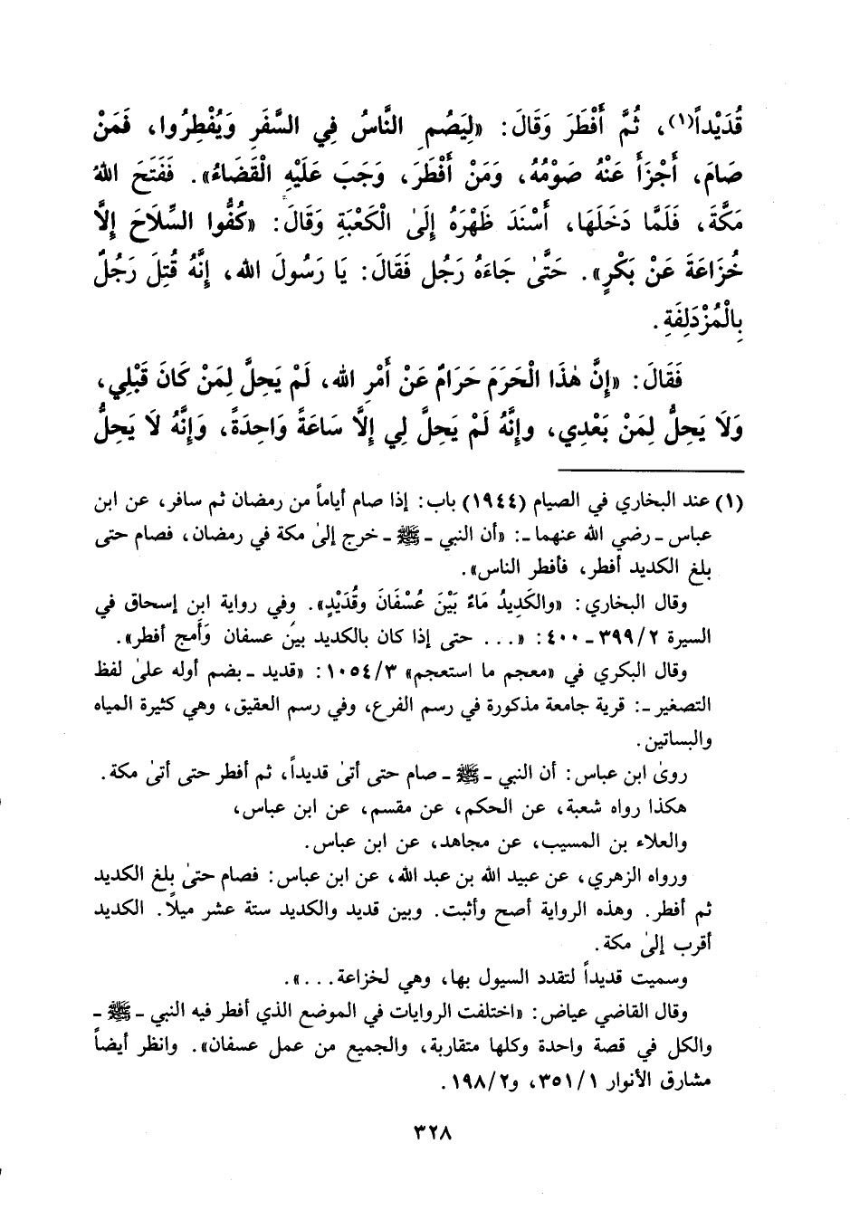 قُدَيْداً (¬1)، ثُم أفْطَرَ وَقَالَ:" لِيَصُمِ النَّاسُ فِي السَّفَرِ وَيُفْطِرُوا، فمنْ صام، أجْزَأَ عَنْهُ صَوْمُهُ، وَمَنْ أفْطَرَ، وَجَبَ عَلَيْهِ الْقَضَاءُ". فَفَتَحَ الله مَكَّةَ، فَلَمَّا دَخَلَهَا، أسْنَدَ ظَهْرَهُ إِلَى الْكَعْبَةِ وَقَالَ: "كُفُوا السِّلاح إلاَّ خُزَاعَةَ عَنْ بَكْرٍ". حَتى جَاءَهُ رَجُل فَقَالَ: يَا رسول الله، إنّهُ قُتِلَ رَجُلٌ بِالْمُزْدَلِفَةِ. فَقَالَ: "إنَّ هذَا الْحَرَمَ حَرَامٌ عَنْ أمْرِ الله، لمْ يَحِلَّ لِمَنْ كَانَ قَبْلِي، وَلا يَحِلُّ لِمَنْ بَعْدِي، وإنه لَمْ يَحِلَّ لِي إِلاَّ سَاعَةً وَاحِدَةً، وَإِنَّهُ لا يَحِلُّ