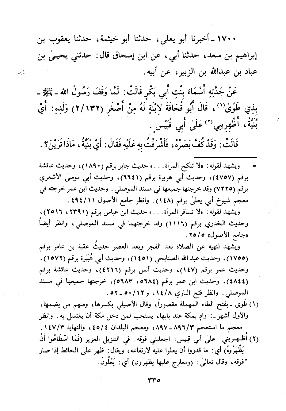 1700 - أخبرنا أبو يعلي، حدثنا أبو خيثمة، حدثنا يعقوب بن إبراهيم بن سعد، حدثنا أبي، عن ابن إسحاق قال: حدثني يحيى بن عباد بن عبد الله بن الزبير، عن أبيه. عَنْ جَدَّتِهِ أسْمَاءَ بِنْتِ أبِي بَكْرٍ قَالَتْ: لَمَّا وَقَفَ رَسُولُ الله -صلى الله عليه وسلم- بِذِي طَوًى (¬1)، قَالَ أبُو قُحَافَةَ لابْنَةٍ لَهُ مِنْ أصْغَرِ (132/ 2) وَلَدِهِ: أيْ بُنَيَّةُ، أظْهِرِينِي (¬2) عَلَى أبِي قُبَيْسٍ. قَالَتْ: وَقَدْ كُف بَصَرُهُ، فَاَشْرَفْتُ بِهِ عَلَيْهِ فَقَالَ: أَيْ بُنَيَّةُ، مَاذَا تَرَيْنَ؟.