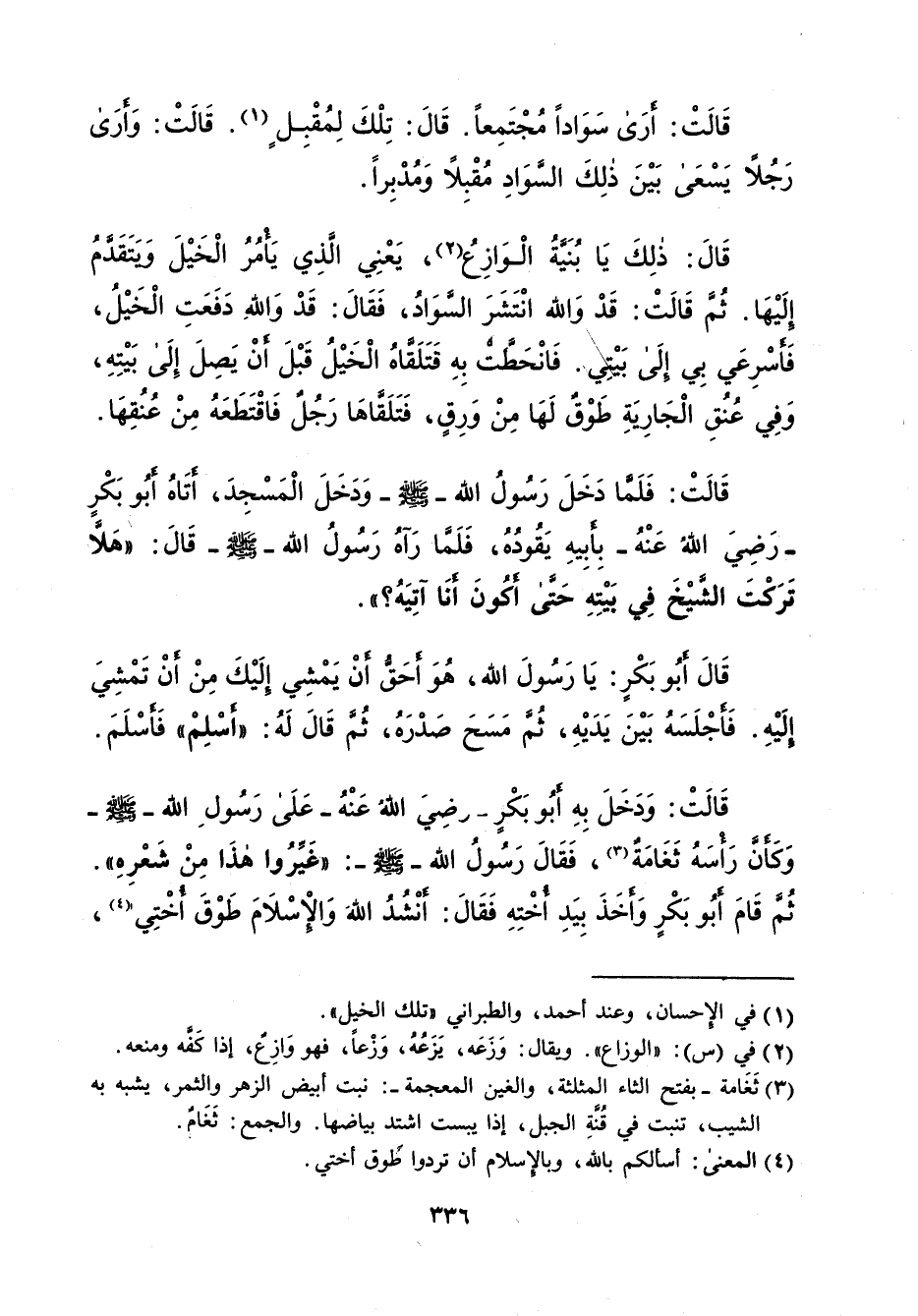 قَالَتْ: أرَى سَوَاداً مُجْتَمِعاً. قَالَ: تِلْكَ لِمُقْبِلٍ (¬1). قَالَتْ: وَأرَى رَجُلاً يَسْعَى بَيْنَ ذلِكَ السَّواد مُقْبِلاً وَمُدْبِراً. قَالَ: ذلِكَ يَا بُنَيَّةُ الْوَازِعُ (¬2)، يَعْنِي الّذِي يَأْمُرُ الْخَيْلَ وَيتَقَدَّمُ إلَيْهَا. ثُمّ قَالَتْ: قَدْ وَالله انْتَشَرَ السَّوادُ، فَقَالَ: قَدْ وَاللهِ دَفَعَتِ الْخَيْلُ، فَأَسْرِعَي بِي إلَى بَيْتِي. فَانْحَطَّت بِهِ قَتَلقَّاهُ الْخَيْلُ قَبْلَ أنْ يَصِلَ إِلَى بَيْتِهِ، وَفِي عُنُقِ الْجَارِيَةِ طَوْقٌ لَهَا مِنْ وَرِقٍ، فَتَلَقَّاهَا رَجُلٌ فَاقْتَطَعَهُ مِنْ عُنُقِهَا. قَالَتْ: فَلَمَّا دَخَلَ رَسُولُ الله -صلى الله عليه وسلم- وَدَخَلَ الْمَسْجِدَ، أتَاهُ أبُو بَكْرِ -رَضِيَ الله عَنْهُ- بِأبِيهِ يَقُودُة، فَلَمَّا رآهُ رَسُولُ الله -صلى الله عليه وسلم- قَالَ: "هَلاَّ تَرَكْتَ الشَّيْخَ فِي بَيْتِهِ حَتى أكونَ أنَا آتِيَهُ؟ ". قَالَ أبُو بَكْرٍ: يَا رسول الله، هُوَ أحَقُّ أنْ يَمْشِي إلَيْكَ مِنْ أنْ تَمْشِيَ إلَيْهِ. فَأجْلَسَهُ بَيْنَ يَدَيْهِ، ثمَّ مَسَحَ صَدْرَهُ، ثُم قَالَ لَهُ: "أسْلِمْ" فَأسْلَمَ. قَالَتْ: وَدَخَلَ بِهِ أبُو بَكْرٍ - رضِيَ الله عَنْهُ- عَلَى رَسُولِ الله -صلى الله عليه وسلم- وَكَأن رَأسَهُ ثَغَامَةٌ (¬3)، فَقَالَ رَسُولُ الله -صلى الله عليه وسلم-: "غَيِّرُوا هذَا مِنْ شَعْرِهِ". ثُم قَامَ أبُو بَكْرٍ وَأخَذَ بِيَدِ اخْتِهِ فَقَالَ: أنْشُدُ اللهَ وَالإسْلاَمَ طَوْقَ أُخْتِي (¬4)،