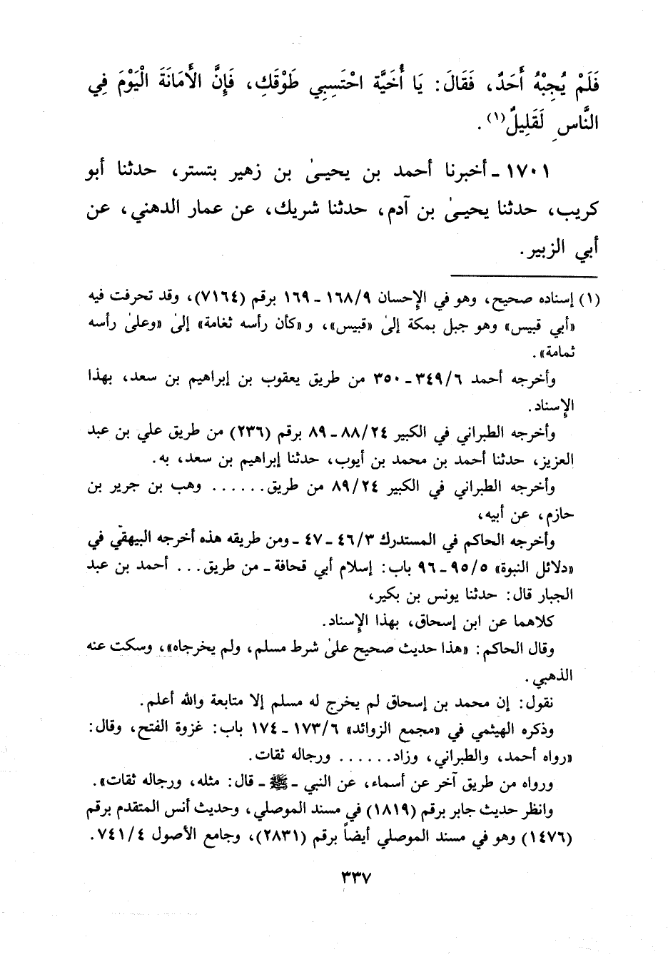 1701 - أخبرنا أحمد بن يحيى بن زهير بتستر، حدثنا أبو غريب، حدثنا يحيى بن آدم، حدثنا شريك، عن عمار الدهني، عن أبي الزبير.