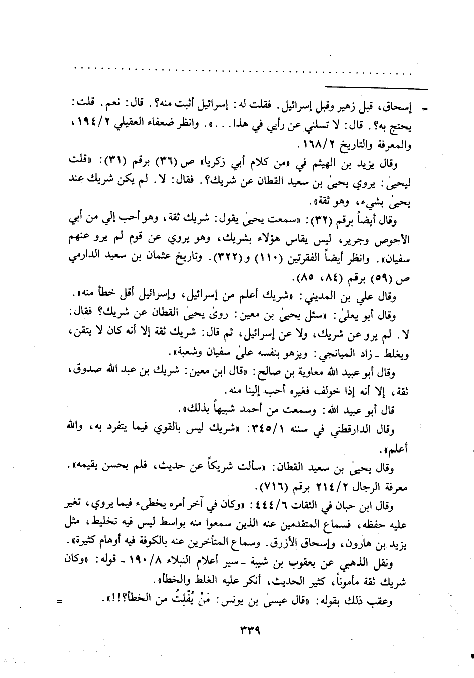 وقال أيضاً برقم (32): "سمعت يحيى يقول: شريك ثقة، وهو أحب إلي من أبي الأحوص وجرير، ليس يقاس هؤلاء بشريك، وهو يروي عن قوم لم يرو عنهم سفيان". وانظر أيضاً الفقرتين (110) و (322). وتاريخ عثمان بن سعيد الدارمي ص (59) برقم (84، 85).
