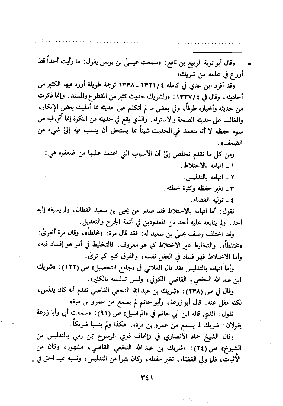 وقال الشيخ حماد الأنصاري في "إتحاف ذوي الرسوخ بمن رمي بالتدليس من الشيوخ" ص (24): "شريك بن عبد الله النخعي القاضي، مشهور، وكان من الأثبات، فلما ولي القضاء، تغير حفظه، وكان يتبرأ من التدليس، ونسبه عبد الحق في =