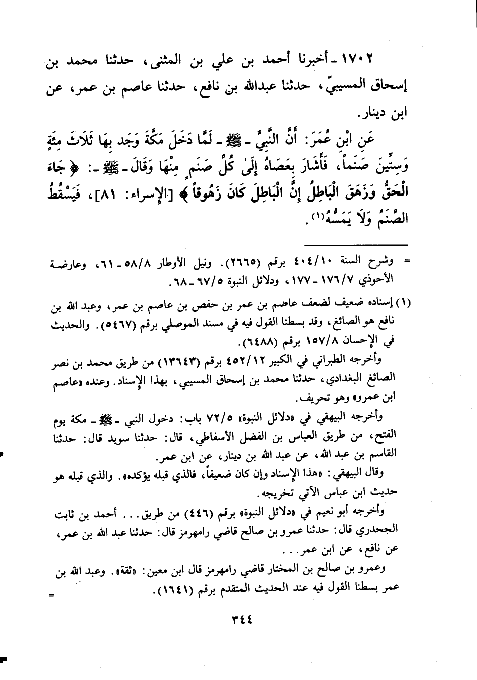 1702 - أخبرنا أحمد بن علي بن المثنى، حدثنا محمد بن إسحاق المسيبى، حدثت عبد الله بن نافع، حدثنا عاصم بن عمر، عن ابن دينار. عَنِ ابْنِ عُمَرَ: أن النَّبِيّ-صلى الله عليه وسلم-لَمَّا دَخَلَ مَكةَ وَجَد بِهَا ثَلاثَ مِئَةٍ وَسِتينَ صَنَماً، فَأشَارَ بعَصَاهُ إلَى كُل صَنَمٍ مِنْهَا وَقَالَ -صلى الله عليه وسلم-: {جَاءَ الْحَقُّ وَزَهَقَ الْبَاطِلُ إِنَّ الْبَاطِلَ كَانَ زَهُوقًا} [الإسراء: 81]، فَيَسْقُطُ الصَّنم وَلا يَمَسُّهُ (¬1).