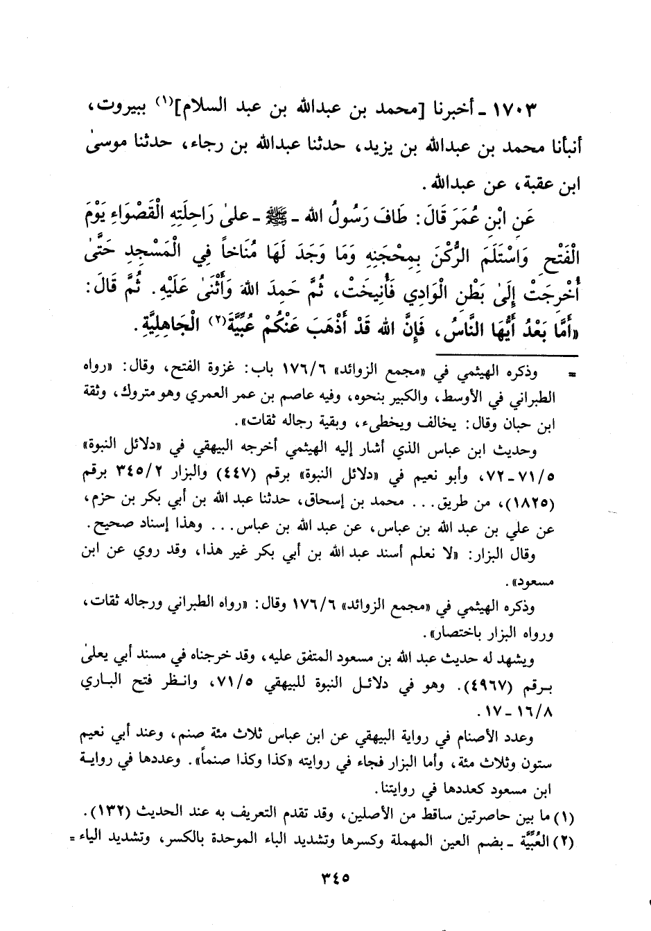 1703 - أخبرنا [محمد بن عبد الله بن عبد السلام] (¬1) ببيروت، أنبأنا محمد بن عبد الله بن يزيد، حدثنا عبد الله بن رجاء، حدثنا موسى ابن عقبة، عن عبد الله. عَنِ ابْنِ عُمَرَ قَالَ: طَافَ رَسُولُ الله -صلى الله عليه وسلم- على رَاحِلَتِهِ الْقَصْوَاءِ يَوْمَ الْفَتْحِ وَاسْتَلَمَ الرُّكْنَ بِمِحْجَنِهِ وَمَا وَجَدَ لَهَا مُنَاخاً فِي الْمَسْجِدِ حَتى أُخْرِجَتْ إلَى بَطْنِ الْوَادِي فَأُنِيخَتْ، ثُمَّ حَمِدَ اللهَ وَأثْنَى عَلَيْهِ. ثُمَّ قَالَ: "أمَّا بَعْدُ أيُّهَا النَّاسُ، فَإنَّ الله قَدْ أَذْهَبَ عَنْكُمْ عُبِّيَّةَ (¬2) الْجَاهِلِيَّةِ.