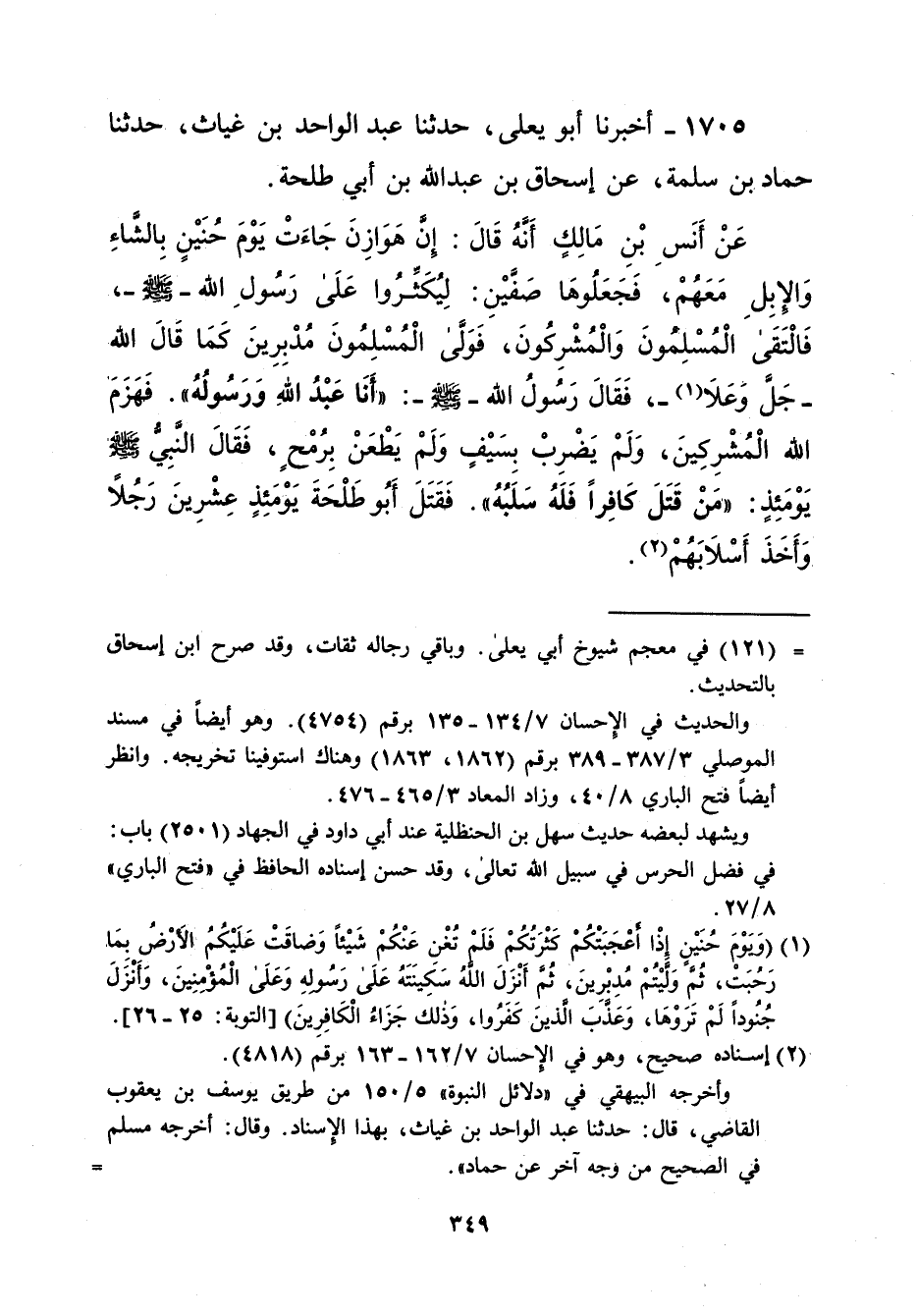 1705 - أخبرنا أبو يعلى، حدثنا عبد الواحد بن غياث، حدثنا حماد بن سلمة، عن إسحاق بن عبد الله بن أبي طلحة. عَنْ أَنَسِ بْنِ مَالِك أَنَّهُ قَالَ: إنَّ هَوَازِنَ جَاءَتْ يَوْمَ حُنَيْنٍ بِالشَّاءِ وَالإبِلِ مَعَهُمْ، فَجَعَلُوهَا صَفَّيْنِ: لِيُكَثِّرُوا عَلَى رَسُولِ الله -صلى الله عليه وسلم-، فَالْتَقَى الْمُسْلِمُونَ وَالْمُشْرِكُونَ، فَوَلَّى الْمُسْلِمُونَ مُدْبِرِينَ كَمَا قَالَ الله -جَلَّ وَعَلا (¬1) -، فَقَالَ رَسُولُ الله -صلى الله عليه وسلم-: "أَنَا عَبْدُ اللهِ وَرَسُولُهُ". فَهَزَمَ الله الْمُشْرِكِينَ، وَلَمْ يَضْرِبْ بِسَيْفٍ وَلَمْ يَطْعَنْ بِرُمْح، فَقَالَ النَّبِيُّ -صلى الله عليه وسلم- يَوْمَئِذ: "مَنْ قَتَلَ كَافِراً فَلَهُ سَلَبُهُ". فَقَتَلَ أَبُوطَلْحَةَ يَوْمَئذٍ عِشْرِينَ رَجُلاً وَأَخَذَ أَسْلابَهُمْ (¬2).