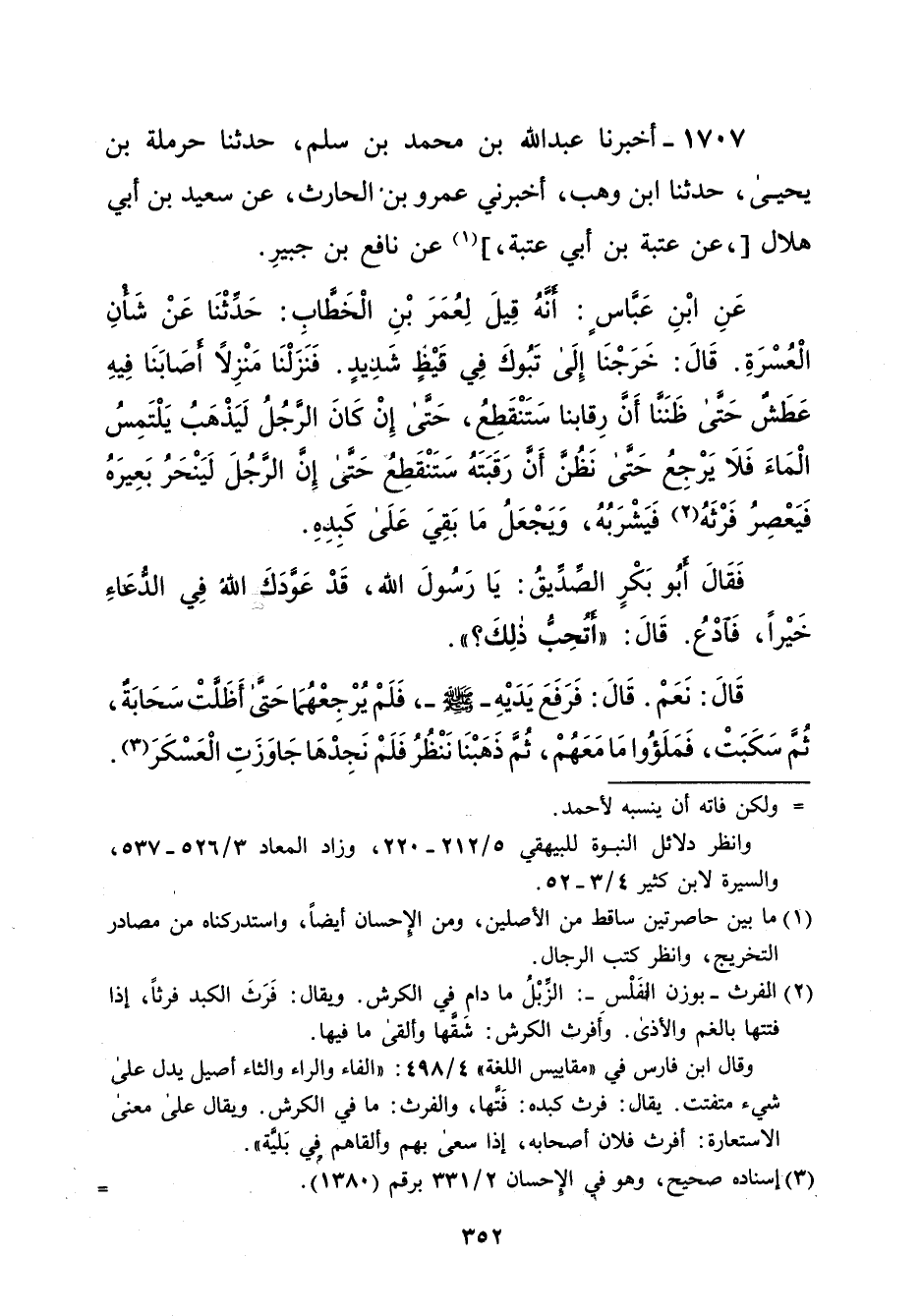 1707 - أخبرنا عبد الله بن محمد بن سلم، حدثنا حرملة بن يحيى، حدثنا ابن وهب، أخبرني عمرو بن الحارث، عن سعيد بن أبي هلال [، عن عتبة بن أبي عتبة،] (¬1) عن نافع بن جبيرِ. عَنِ ابْنِ عَباس: أنَّهُ قِيلَ لِعُمَرَ بْنِ الْخَطابِ: حدثنا عَنْ شَأْنِ الْعُسْرَةِ. قَالَ: خَرَجْنَا إِلَى تَبُوكَ فِي قَيْظٍ شَديدٍ. فَنَزَلْنَا مَنْزِلاً أصَابَنَا فِيهِ عطشٌ حَتى ظَنَنا أَنَ رِقابنا سَتَنْقَطِعُ، حتَّى إِنْ كَانَ الرَّجُلُ لَيَذْهَبُ يَلْتَمِسُ الْمَاءَ فَلا يَرْجِعُ حَتَّى نَظُنَّ أَنَّ رَقَبَتَهُ سَتَنْقَطِعُ حَتى إِنَّ الرَّجُلَ لَيَنْحَرُ بَعِيرَهُ فَيَعْصِرُ فَرْثَهُ (¬2) فَيَشْرَبُهُ، وَيجْعَلُ مَا بَقِيَ عَلَى كَبِدهِ. فَقَالَ أبُو بَكْرٍ الصديق: يَا رسول الله، قَدْ عَوَّدَكَ اللهُ فِي الدُّعَاءِ خَيْراً، فَادْعُ. قَالَ: "أتحب ذلِكَ؟ ". قَالَ: نَعَمْ. قَالَ: فَرَفَعَ يَدَيْهِ -صلى الله عليه وسلم-، فَلَمْ يُرْجِعْهُمَا حَتَّى أظلَّتْ سَحَابَةٌ، ثُمّ سَكَبَتْ، فَمَلَؤُوا مَا مَعَهُمْ، ثُمّ ذَهَبْنَا نَنْظُرُ فَلَمْ نَجِدْهَا جَاوَزَتِ الْعَسْكَرَ (¬3).