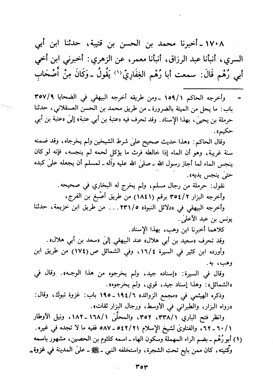 1708 - أخبرنا محمد بن الحسن بن قتيبة، حدثنا ابن أبي السري، أنبأنا عبد الرزاق، أنبأنا معمر، عن الزهري: أخبرني ابن أخي أبي رُهْم قَالَ: سمعت أبا رُهْم الغِفَارِيّ (¬1) يَقُولُ- وَكَانَ مِنْ أصْحَابِ