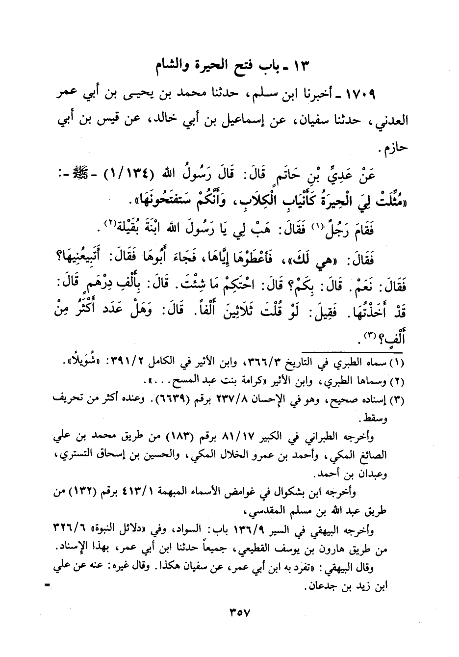 1709 - أخبرنا ابن سلم، حدثنا محمد بن يحيى بن أبي عمر العدني، حدثنا سفيان، عن إسماعيل بن أبي خالد، عن قيس بن أبي حازم. عَنْ عَدِيِّ بْنِ حَاتَمٍ قَالَ: قَالَ رَسُولُ الله (1/ 134) -صلى الله عليه وسلم-: "مُثِّلَتْ لِيَ الْحِيرَةُ كَأَنْيَابِ الْكِلاَبِ، وَأنَّكُمْ سَتفتَحُونَهَا". فَقَامَ رَجُلٌ (¬1) فَقَالَ: هَبْ لِي يَا رسُولَ الله ابْنَةَ بُقَيْلة (¬2). فَقَالَ: "هي لَكَ"، فَأعْطَوْهَا إِيَّاهَا، فَجَاءَ أبُوهَا فَقَالَ: أَتَبِيعُنِيهَا؟ فَقَالَ: نَعَمْ. قالَ: بِكَمْ؟ قَالَ: احْتَكِمْ مَا شِئْتَ. قالَ: بِأَلْفِ دِرْهَمٍ قالَ: قَدْ أخَذْتُهَا. فَقِيلَ: لَوْ قُلْتَ ثَلاثِينَ ألْفاً. قَالَ: وَهَلْ عَدَد أكْثَرُ مِنْ ألْفٍ؟ (¬3).