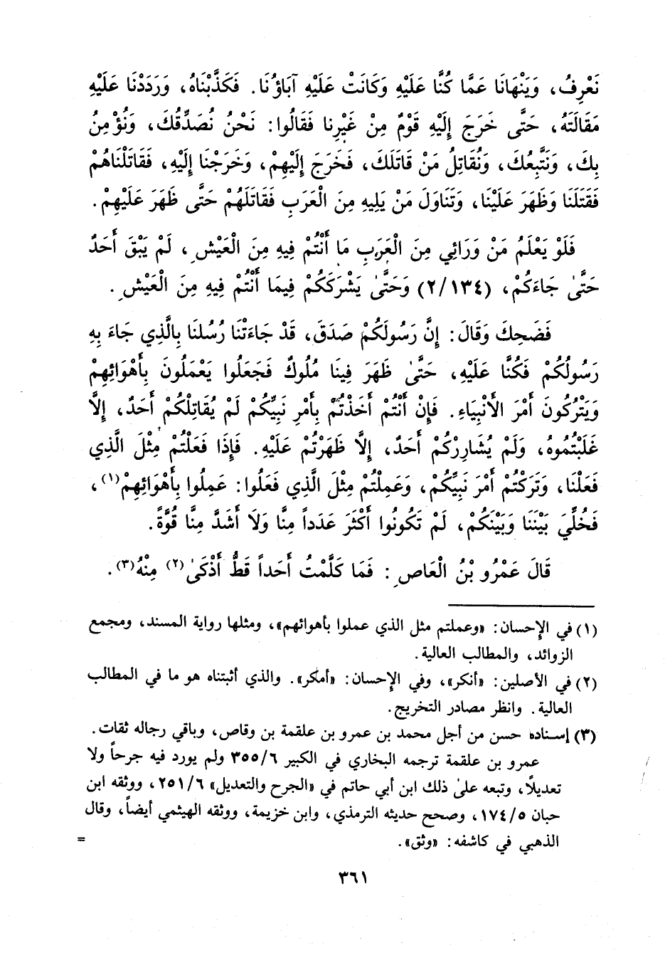 نَعْرِفُ، وَينْهَانَا عمَّا كُنَّا عَلَيْهِ وَكَانَتْ عَلَيْهِ آبَاؤُنَا. فَكَذَّبْنَاهُ، وَرَدَدْنَا عَلَيْهِ مَقَالَتَهُ، حَتَّى خَرَجَ إِلَيْهِ قَوْمٌ مِنْ غَيرِنا فَقَالُوا: نَحْنُ نُصَدِّقُكَ، وَنُؤْمِنُ بِكَ، وَنَتَّبِعُكَ، وَنُقَاتِلُ مَنْ قَاتَلَكَ، فَخَرَجَ إلَيْهِمْ، وَخَرَجْنَا إِلَيْهِ، فَقَاتَلْنَاهُمْ فَقَتَلَنَا وَظَهَرَ عَلَيْنَا، وَتَنَاوَلَ مَنْ يَلِيهِ مِنَ الْعَرَبِ فَقَاتَلَهُمْ حَتَّى ظَهَرَ عَلَيْهِمْ. فَلَوْ يَعْلَمُ مَنْ وَرَائِي مِنَ العرب مَا أنْتُمْ فِيهِ مِنَ الْعَيْشِ، لَمْ يَبْقَ أحَدٌ حَتَّى جَاءَكُمْ، (134/ 2) وَحَتَى يَشْرَكَكُمْ فِيمَا أنْتُمْ فِيهِ مِنَ الْعَيْشِ. فَضَحِكَ وَقَالَ: إنَّ رَسُولَكُم صَدَقَ، قَدْ جَاءَتْنَا رُسُلنَا بِالَّذِي جَاءَ بِهِ رَسُولُكُمْ فَكُنَّا عَلَيْهِ، حَتَّى ظَهَرَ فِينَا مُلُوكٌ فَجَعَلُوا يَعْمَلُونَ بِأهْوَائِهِمْ وَيتْرُكُونَ أمْرَ الأنْبِيَاءِ. فَإنْ أنْتُمْ أخَذْتُمْ بِأَمْرِ نَبِيِّكُمْ لَمْ يُقَاتِلْكُمْ أحَدٌ، إِلاَّ غَلَبْتُمُوهُ، وَلَمْ يُشَارِرْكُمْ أحَدٌ، إلاَّ ظَهَرْتُمْ عَلَيْهِ. فَإِذَا فَعَلْتُمْ مِثْلَ الّذِي فَعَلْنَا، وَتَرَكْتُمْ أمْرَ نَبِيِّكُمْ، وَعَمِلْتُمْ مِثْلَ الّذِي فَعَلُوا: عَمِلُوا بِأَهْوَائِهِمْ (¬1)، فَخُلِّيَ بَيْنَنَا وَبَيْنَكُمْ، لَمْ تَكُونُوا أكْثَرَ عَدَداً مِنَّا وَلاَ أشَدَّ مِنَّا قُوَّةً. قَالَ عَمْرُو بْنُ الْعَاصِ: فَمَا كَلَّمْتُ أحَداً قَطًّ أذْكَى (¬2) مِنْهُ (¬3).