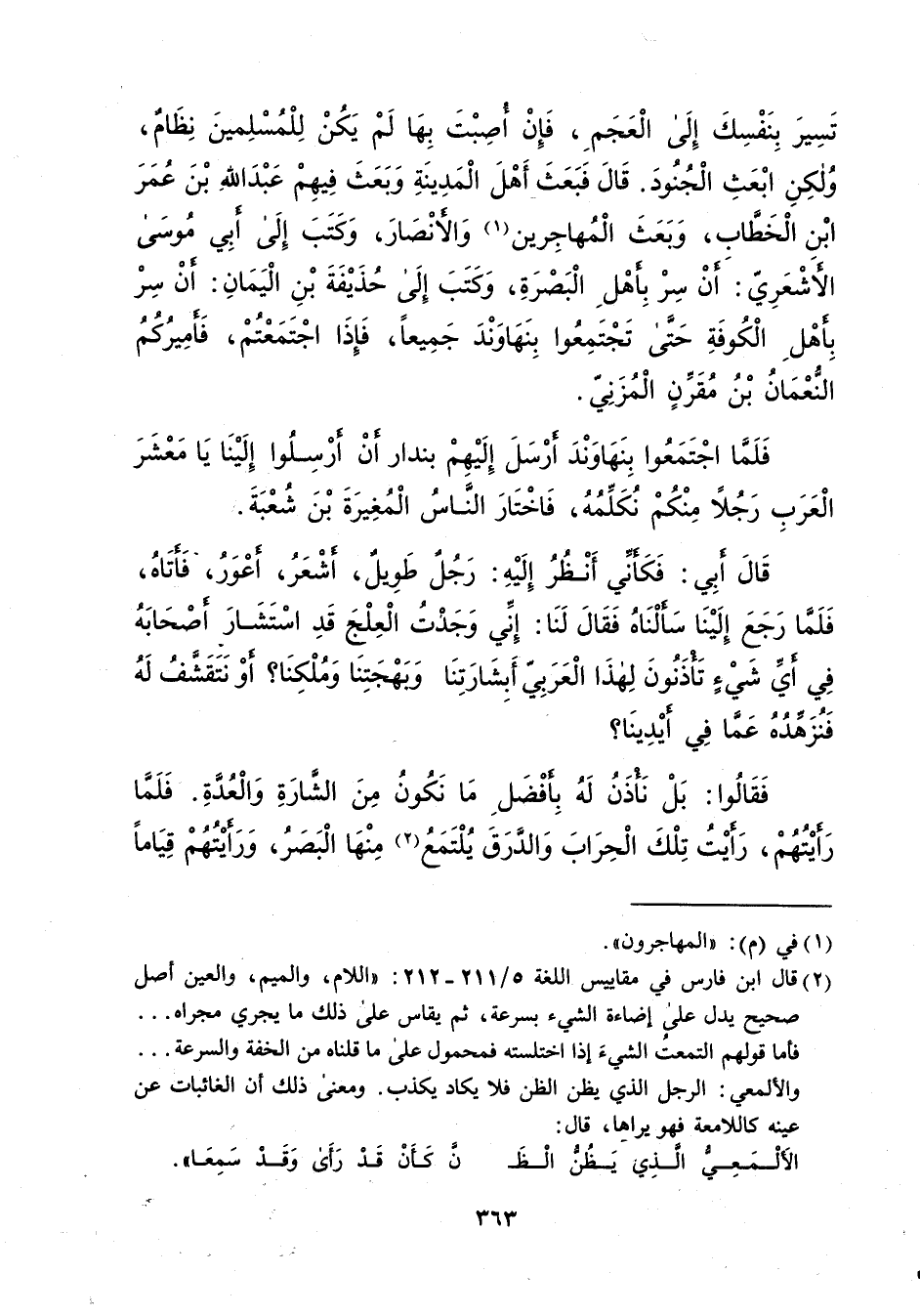تَسِيرَ بِنَفْسِكَ إِلَى الْعَجَمِ، فَإِنْ اُّصِبْتَ بِهَا لَمْ يَكُنْ لِلْمُسْلِمينَ نِظَام، وُلكِنِ ابْعَثِ الْجُنُودَ. قَالَ فَبَعَثَ أَهلَ الْمَدِينَةِ وَبَعَثَ فِيهِمْ عَبْدَ اللهِ بْنَ عُمَرَ ابْنِ الْخَطابِ، وَبَعَثَ الْمُهاجِرين (¬1) وَالأنْصَارَ، وَكَتَبَ إِلَى أبِي مُوسَى الأشْعَرِى: أنْ سِرْ بِأهْلِ الْبَصْرَةِ، وَكَتَبَ إِلَى حُذَيْفَةَ بْنِ الْيَمَانِ: أنْ سِرْ بِأهْلِ الْكُوفَةِ حَتَّى تَجْتَمِعُوا بِنَهَاوَنْدَ جَمِيعاً، فَإذَا اجْتَمَعْتُمْ، فَأمِيرُكُمُ النُّعْمَانُ بْنُ مُقَرِّنٍ الْمُزَنِيّ. فَلَمَّا اجْتَمَعُوا بِنَهَاوَنْدَ أرْسَلَ إِلَيْهِمْ بندار أنْ أرْسِلُوا إِلَيْنَا يَا مَعْشَرَ الْعَرَبِ رَجُلاً مِنْكُمْ نُكَلِّمُهُ، فَاخْتَارَ النَاس الْمُغِيرَةَ بْنَ شُعْبَةَ. قَالَ أَبِي: فَكَأنِّي أَنْظُرُ إِلَيْهِ: رَجُل طَوِيل، أشْعَرُ، أعْوَرُ، فَأتَاهُ، فَلَمَّا رَجَعَ إلَيْنَا سَألْنَاهُ فَقَالَ لَنَا: إِنِّي وَجَدتُ الْعِلْجَ قَدِ اسْتَشَارَ أصْحَابَهُ فِي أيِّ شَيْءٍ تَأْذَنُونَ لِهذَا الْعَرَبِيّ أَبِشَارَتِنَا وَبَهْجَتِنَا وَمُلْكِنَا؟ أوْ نَتقَشَّفُ لَهُ فَنُزَهِّدُهُ عَمَّا فِي أيْدِينَا؟ فَقَالُوا: بَلْ نَأْذَنُ لَهُ بِأفْضَلِ مَا نَكُونُ مِنَ الشَّارَةِ وَالْعُدَّةِ. فَلَمَّا رَأيْتُهُمْ، رَأيْتُ تِلْكَ الْحِرَابَ وَالدَّرَقَ يُلْتَمَعُ (¬2) مِنْهَا الْبَصَرُ، وَرَأيْتُهُمْ قِيَاماً