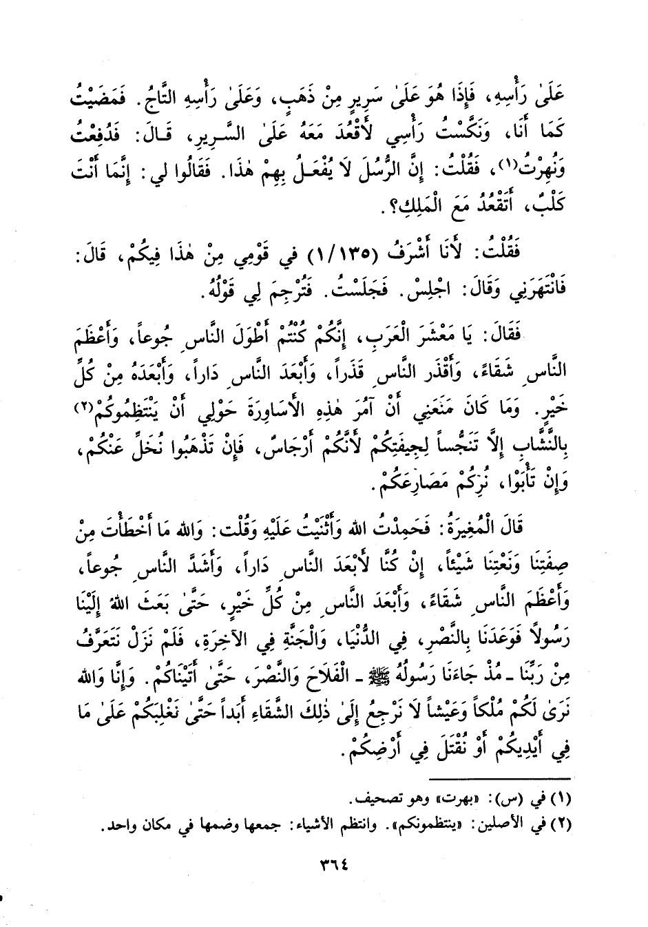 عَلَى رَأْسِهِ، فَإِذَا هُوَ عَلَى سَرِيرٍ مِنْ ذَهَبٍ، وَعَلَى رَأْسِهِ التَّاجُ. فَمَضَيْتُ كَمَا أنَا، وَنَكَّسْتُ رَأْسِي لأقْعُدَ مَعَهُ علَى السَّرِيرِ، قَالَ: فَدُفِعْتُ وَنُهِرْتُ (¬1)، فَقُلْتُ: إِنَّ الرُّسُلَ لاَ يُفْعَلُ بِهِمْ هذَا. فَقَالُوا لي: إِنَّمَا أنْتَ كَلْبٌ، أتَقْعُدُ مَعَ الْمَلِكِ؟. فَقُلْتُ: لأنَا أشْرَفُ (135/ 1) في قَوْمِي مِنْ هذَا فِيكُمْ، قَالَ: فَانْتَهَرَنِي وَقَالَ: اجْلِسْ. فَجَلَسْتُ. فَتُرْجِمَ لِي قَوْلُهُ. فَقَالَ: يَا مَعْشَرَ الْعَرَبِ، إنَّكُمْ كُنْتُمْ أطْوَلَ النَّاسِ جُوعاً، وَأعْظَمَ النَّاسِ شَقَاءً، وَأقْذَر النَّاسِ قَذَراً، وَأَبْعَدَ النَّاسِ دَاراً، وَأبْعَدَهُ مِنْ كُل خَيْرٍ. وَمَا كَانَ منَعَنِي أنْ آمُرَ هذِهِ الأسَاوِرَةَ حَوْلي أنْ يَنْتَظِمُوكُمْ (¬2) بِالنَّشَّابِ إلا تَنَجُّساً لِجِيفَتِكُمْ لأنَّكُمْ أرْجَاسٌ، فَإِنْ تَذْهَبُوا نُخَلِّ عَنْكُمْ، وَإِنْ تَابَوْا، نُرِكُمْ مَصَارِعَكُمْ. قَالَ الْمغِيرَةُ: فَحَمِدْتُ الله وَأثْنَيْتُ عَلَيْهِ وَقُلْت: وَالله مَا أخْطَأْتَ مِنْ صِفَتِنَا وَنَعْتِنَا شَيْئاً، إِنْ كُنَّا لأبْعَدَ النَّاسِ دَاراً، وَأشَد النَّاسِ جُوعاً، وَأعْظَمَ النَّاسِ شَقَاءً، وَأبْعَدَ النَّاسِ مِنْ كُلِّ خَيْرٍ، حَتَّى بَعَثَ الله إِلَيْنَا رَسُولاً فَوَعَدَنَا بِالنَّصْرِ، فِي الدُّنْيَا، وَالْجَنَّةِ فِي الآخِرَةِ، فَلَمْ نَزَلْ نَتَعَرَّفُ مِنْ رَبِّنَا- مُذْ جَاءَنَا رَسُولُهُ-صلى الله عليه وسلم-الْفَلاَح وَالنَّصْرَ، حَتَّى أتَيْنَاكُمْ. وَإنَّا وَالله نَرَى لَكُمْ مُلْكاً وَعَيْشاً لا نَرْجِعُ إِلَى ذلِكَ الشَّقَاءِ أبَداً حَتَّى نَغْلِبَكُمْ عَلَى مَا فِي أيْدِيكُمْ أوْ نُقْتَلَ فِي أرْضِكُمْ.