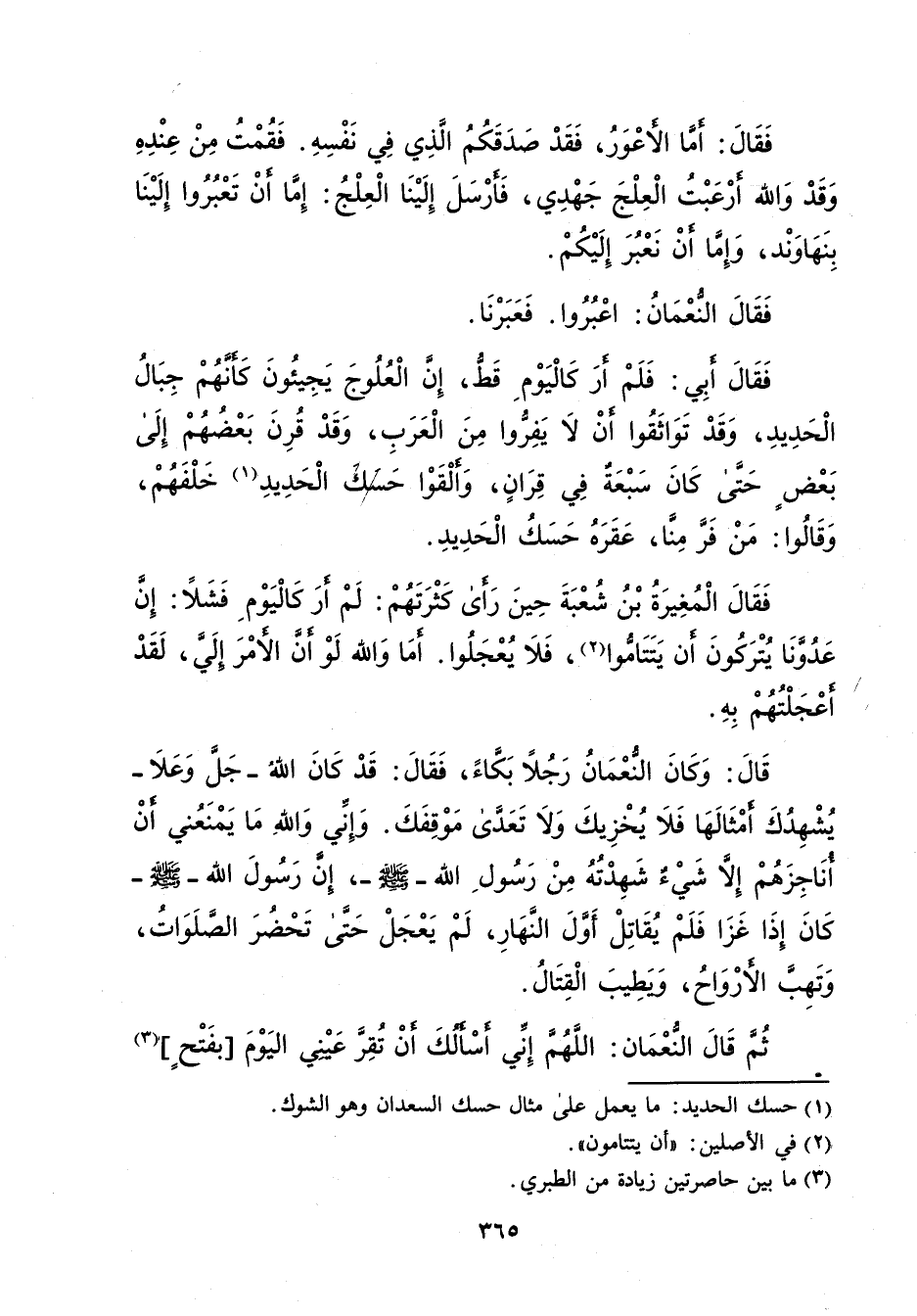 فَقَالَ: أمَّا الأعْوَرُ، فَقَدْ صَدَقَكُمُ الّذِي فِي نَفْسِهِ. فَقُمْتُ مِنْ عِنْدِهِ وَقَدْ وَالله أرْعَبْتُ الْعِلْجَ جَهْدِي، فَأرْسَلَ إِلَيْنَا الْعِلْجُ: إمَّا أنْ تَعْبُرُوا إِلَيْنَا بِنَهَاوَنْد، وَإِمَّا أنْ نَعْبُرَ إِلَيْكُمْ. فَقَالَ النُّعْمَانُ: اعْبُرُوا. فَعَبَرْنَا. فَقَالَ أبِي: فَلَمْ أَرَ كَالْيَوْمِ قَطُّ، إِنَّ الْعُلُوجَ يَجِيئونَ كَأَنَّهُمْ جِبَالُ الْحَدِيدِ، وَقَدْ تَوَاثَقُوا أنْ لا يَفِرُّوا مِنَ الْعَرَبِ، وَقَدْ قُرِنَ بَعْضُهُمْ إِلَى بَعْض حَتَّى كَانَ سَبْعَةٌ فِي قِرَانٍ، وَألْقَوْا حَسَكَ الْحَدِيدِ (¬1) خَلْفَهُمْ، وَقَالُوا: مَنْ فَرَّ مِنَّا، عَقَرَهُ حَسَكُ الْحَدِيدِ. فَقَالَ الْمُغِيرَةُ بْنُ شُعْبَةَ حِينَ رَأى كَثْرَتَهُمْ: لَمْ أرَ كَالْيَوْمِ فَشَلاً: إِنَّ عَدُوَّنَا يُتْرَكُونَ أن يَتَتَامُّوا (¬2)، فَلا يُعْجَلُوا. أمَا وَالله لَوْ أنَّ الأمْرَ إليَّ، لَقَدْ أعْجَلْتُهُمْ بِهِ. قَالَ: وَكَانَ النُّعْمَانُ رَجُلا بَكَّاءً، فَقَالَ: قَدْ كَانَ اللهُ -جَلَّ وَعَلا- يُشْهِدُكَ أَمْثَالَهَا فَلاَ يُخْزِيكَ وَلا تَعَدَّى مَوْقِفَكَ. وَإِنَي وَاللهِ مَا يَمْنَعُني أن أُنَاجِزَهُمْ إِلاَّ شَيْءٌ شَهِدْتُهُ مِنْ رَسُولِ الله-صلى الله عليه وسلم-، إنَّ رسول الله-صلى الله عليه وسلم كَانَ إذَا غَزَا فَلَمْ يُقَاتِلْ أَوَّلَ النَّهَارِ، لَمْ يَعْجَلْ حَتَّى تَحْضُرَ الصَّلَوَاتُ، وَتَهِبَّ الأرْوَاحُ، وَيطِيبَ الْقِتَالُ. ثُمَّ قَالَ النُّعْمَان: اللَّهُمَّ إِنِّي أسْأَلُكَ أنْ تُقِرَّ عَيْني اليَوْمَ [بفَتْحٍ] (¬3)