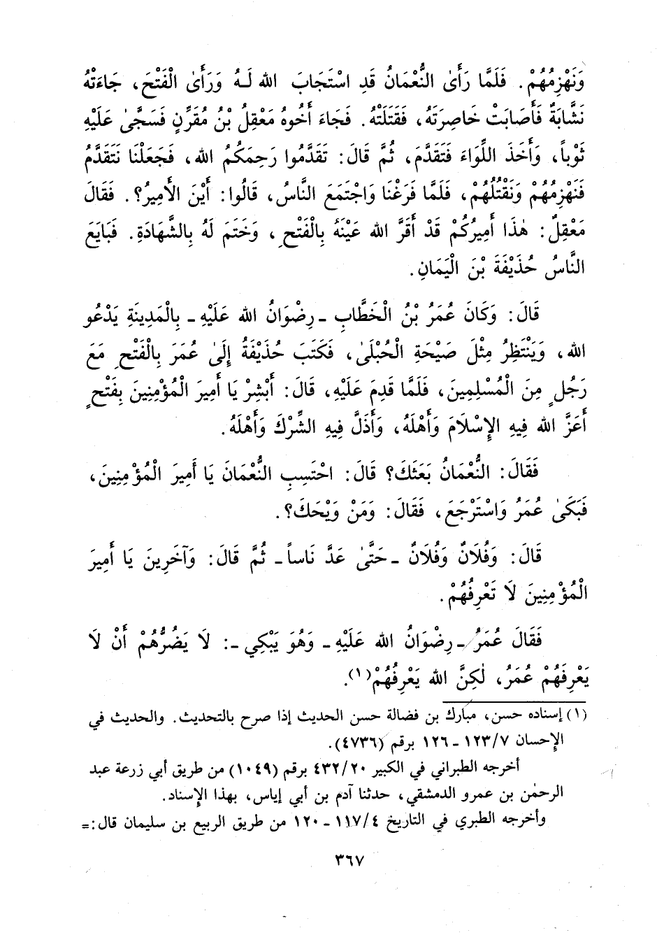 وَنَهْزِمُهُمْ. فَلَمَّا رَأى النُّعْمَانُ قَدِ اسْتَجَابَ الله لَهُ وَرَأَى الْفَتْحَ، جَاءَتْهُ نَشَّابَةٌ فَأصَابَتْ خَاصِرَتَهُ، فَقَتَلَتْهُ. فَجَاءَ أخُوهُ مَعْقِلُ بْنُ مُقَرِّنٍ فَسَجَّى عَلَيْهِ ثَوْباً، وَأخَذَ اللِّوَاءَ فَتَقَدَّمَ، ثُمَّ قَالَ: تقدَّموا رَحِمَكُمُ الله، فَجَعَلْنَا نتقدَّمُ فَنَهْزِمُهُمْ وَنَقْتُلُهُمْ، فَلَمَّا فَرَغْنَا وَاجْتَمَعَ النَّاسُ، قَالُوا: أَيْنَ الأمِيرُ؟. فَقَالَ مَعْقِلٌ: هذَا أمِيرُكُمْ قَدْ أقَرَّ الله عَيْنَة بِالْفَتْحِ، وَخَتَمَ لَهُ بِالشَهَادَةِ. فَبَايَعَ النَّاسُ حُذَيْفَةَ بْنَ الْيَمَانِ. قَالَ: وَكَانَ عُمَرُ بْنُ الْخَطَّابِ- رِضْوَانُ الله عَلَيْهِ- بِالْمَدِينَةِ يَدْعُو الله، وَينْتَظِرُ مِثْلَ صَيْحَةِ الْحُبْلَى، فَكَتَبَ حُذَيْفَةُ إِلَى عُمَرَ بِالْفَتْحٍ مَعَ رَجُلٍ مِنَ الْمُسْلِمِينَ، فَلَمَّا قَدِمَ عَلَيْهِ، قَالَ: أبْشِرْ يَا أمِيرَ الْمُؤْمِنِينَ بِفتْحٍ أعَزَّ الله فِيهِ الإِسْلاَمَ وَأهْلَهُ، وَأذَلَّ فِيهِ الشَّرْكَ وَأهْلَهُ. فَقَالَ: النُّعْمَانُ بَعَثَكَ؟ قَالَ: احْتَسِبِ النُّعْمَانَ يَا أَمِيرَ الْمُؤْمِنِينَ، فَبَكَى عُمَرُ وَاسْتَرْجَعَ، فَقَالَ: وَمَنْ ويحَكَ؟. قَالَ: وَفُلانٌ وَفُلانٌ- حَتَّى عَدَّ نَاساً- ثُمَّ قَالَ: وَآخَرِينَ يَا أمِيرَ الْمُؤْمِنِينَ لا تَعْرِفُهُمْ. فَقَالَ عُمَر- رِضْوَانُ الله عَلَيْهِ- وَهُوَ يَبْكِي-: لا يَضُرُّهُمْ أنْ لا يَعْرِفَهُمْ عُمَرُ، لكِنَّ الله يَعْرِفُهُمْ (¬1).