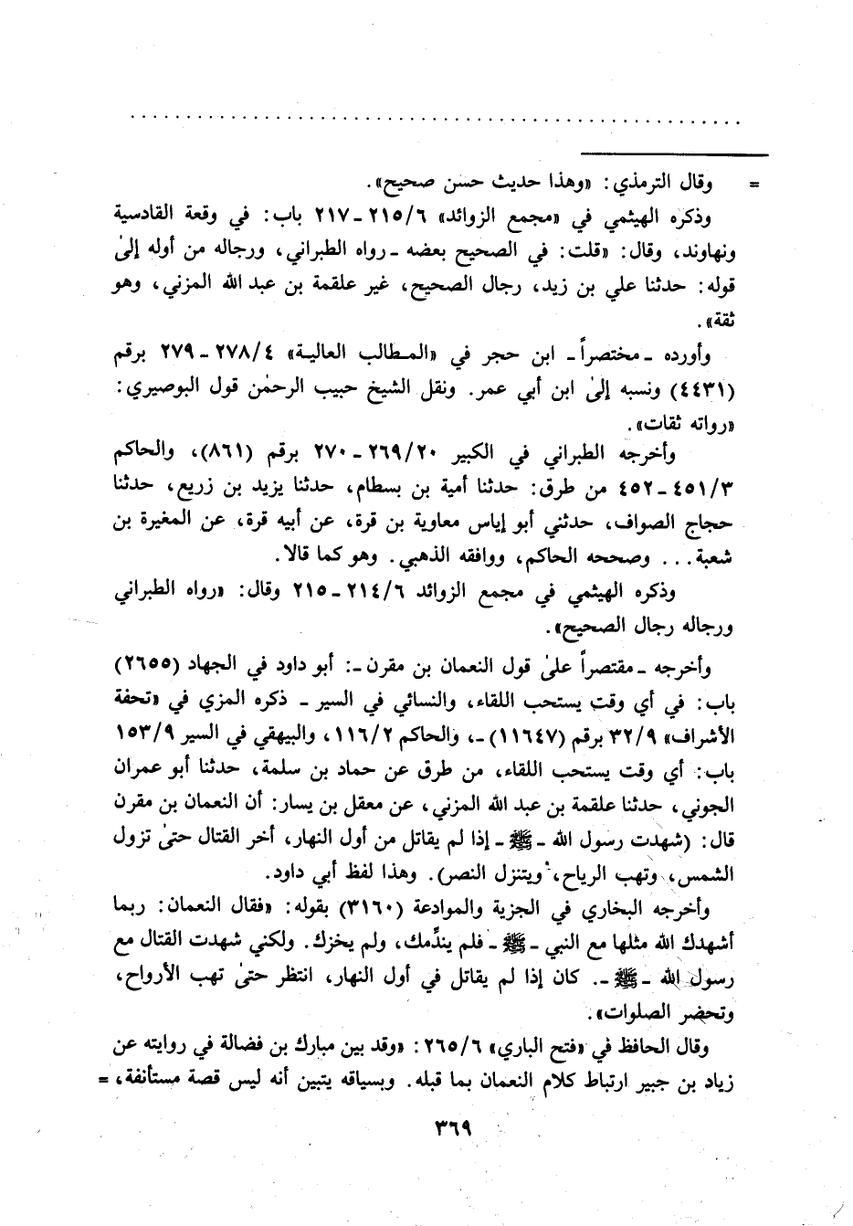 وذكره الهيثمي في "مجمع الزوائد" 6/ 215 - 217 باب: في وقعة القادسية ونهاوند، وقال: "قلت: في الصحيح بعضه- رواه الطبراني، ورجاله من أوله إلى قوله: حدثثا علي بن زيد، رجال الصحيح، غير علقمة بن عبد الله المزني، وهو ثقة".