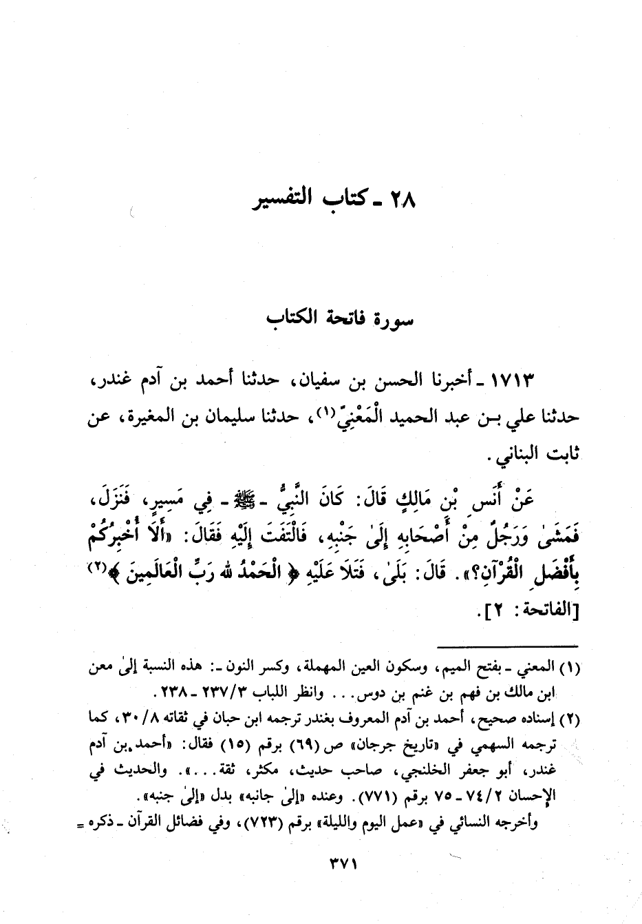 1713 - أخبرنا الحسن بن سفيان، حدثنا أحمد بن آدم غندر، حدثنا علي بن عبد الحميد الْمَعْنِيّ (¬1)، حدثنا سليمان بن المغيرة، عن ثابت البناني. عَنْ أنَسِ بْن مَالِكٍ قَالَ: كَانَ النَّبِيّ -صلى الله عليه وسلم- فِي مَسِيرٍ، فَنَزَلَ، فَمَشَى وَرَجُل مِنْ أَصْحَابِهِ إلَى جَنْبِهِ، فَالْتَفَتَ إلَيْهِ فَقَالَ: "ألاَ أُخْبِرُكُمْ بِأفْضَلِ الْقُرْآنِ؟ ". قَالَ: بَلَى، فَتَلا عَلَيْهِ {الْحَمْدُ لِلَّهِ رَبِّ الْعَالَمِينَ} (¬2) [الفاتحة: 2].