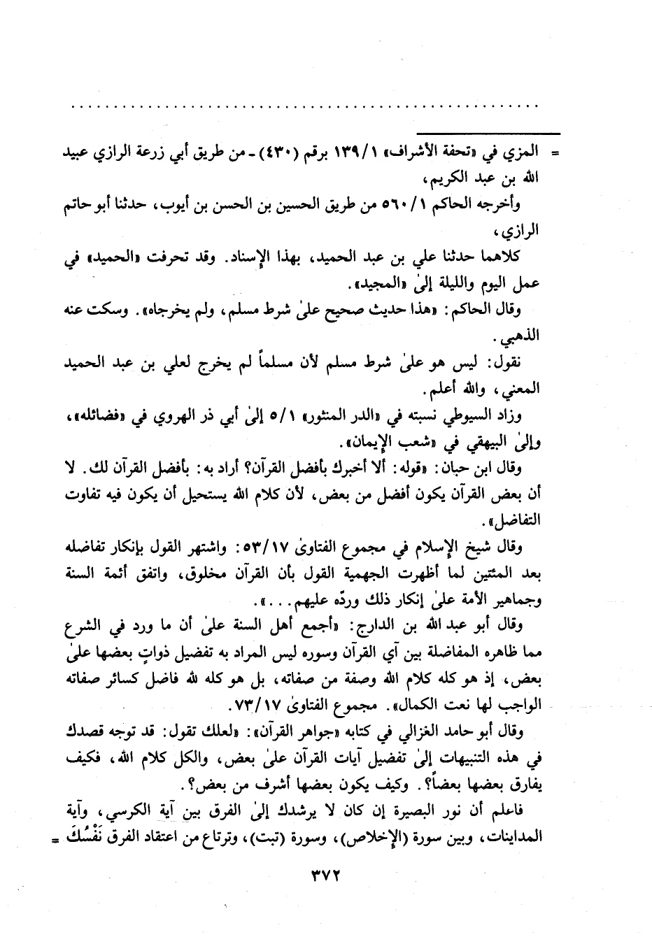 وقال أبو عبد الله بن الدارج: "أجمع أهل السنة على أن ما ورد في الشرع مما ظاهره المفاضلة بين آي القرآن وسوره ليس المراد به تفضيل ذواتٍ بعضها على بعض، إذ هو كله كلام الله وصفة من صفاته، بل هو كله لله فاضل كسائر صفاته الواجب لها نعت الكمال". مجموع الفتاوى 17/ 73.