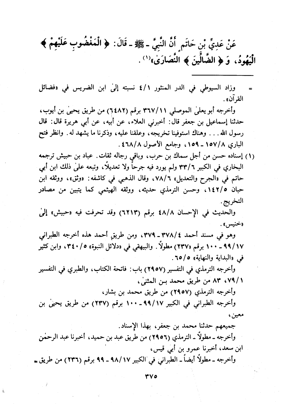 عَنْ عَدِيِّ بْن حَاتَمٍ أنَّ النَّبِيَّ -صلى الله عليه وسلم- قَالَ: (الْمَغْضوبِ عَلَيْهِمْ) اليهود، وَ (الضَّالِّينَ) النَّصَارَى" (¬1).