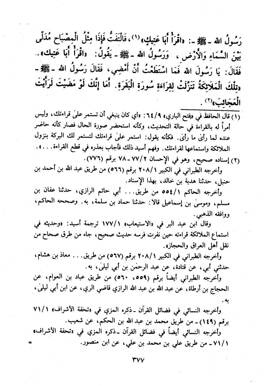 وقال ابن عبد البر في" الاستيعاب" 1/ 177 ترجمة أسيد: "وحديثه في استماع الملائكة قراءته حين نفرت فرسه حديث صحيح، جاء من طرق صحاح من نقل أهل العراق والحجاز".