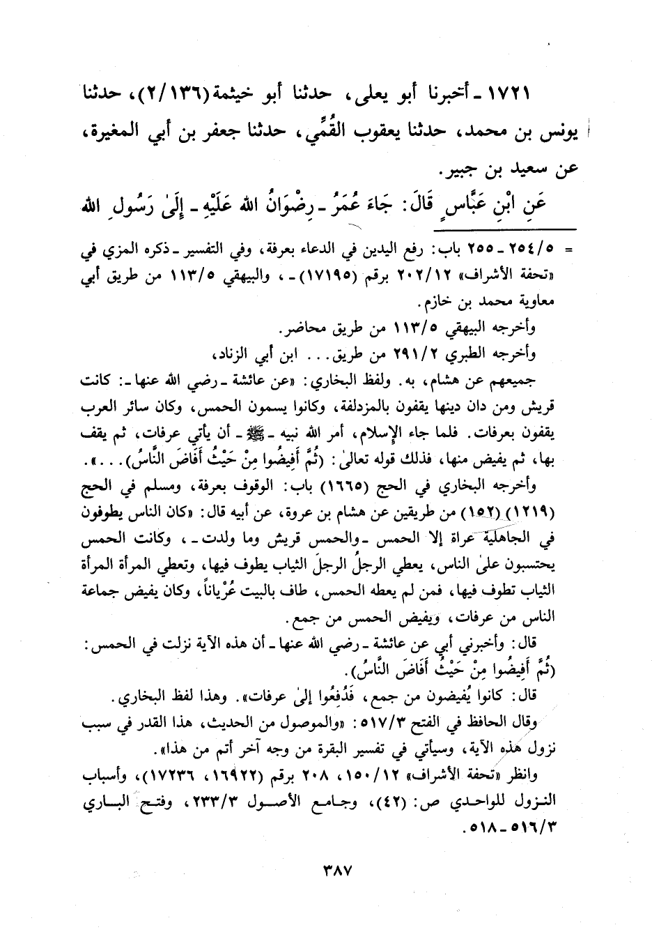 وأخرجه البخاري في الحج (1665) باب: الوقوف بعرفة، ومسلم في الحج (1219) (152) من طريقين عن هشام بن عروة، عن أبيه قال: "كان الناس يطوفون في الجاهلية-عراة إلا الحمس- والحمس قريش وما ولدت-، وكانت الحمس يحتسبون على الناس، يعطي الرجلُ الرجلَ الثياب يطوف فيها، وتعطي المرأة المرأة الثياب تطوف فيها، فمن لم يعطه الحمس، طاف بالبيت عُرْياناً، وكان يفيض جماعة الناس من عرفات، ويفيض الحمس من جمع. قال: وأخبرني أبي عن عائشة -رضي الله عنها- أن هذه الآية نزلت في الحمس: (ثُم أَفِيضُوا مِنْ حَيْثُ أَفَاضَ النَّاسُ).