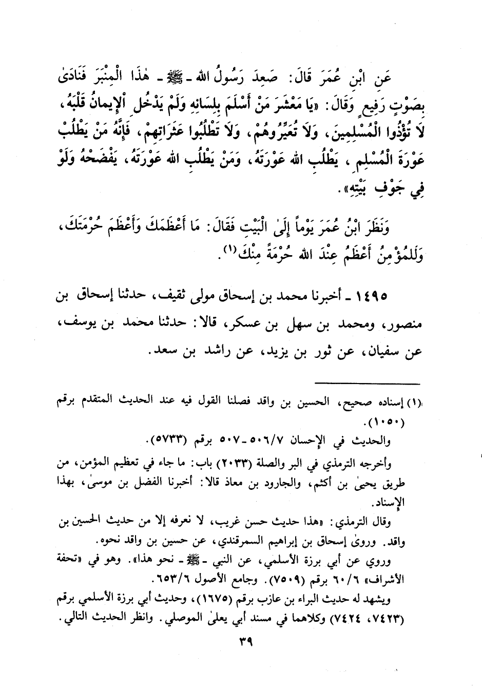 لا تُؤْذُوا الْمُسْلِمِينَ، وَلا تُعَيِّرُوهُمْ، وَلا تَطْلُبُوا عَثَرَاتِهِمْ، فَإِنَّهُ مَنْ يَطْلُبْ