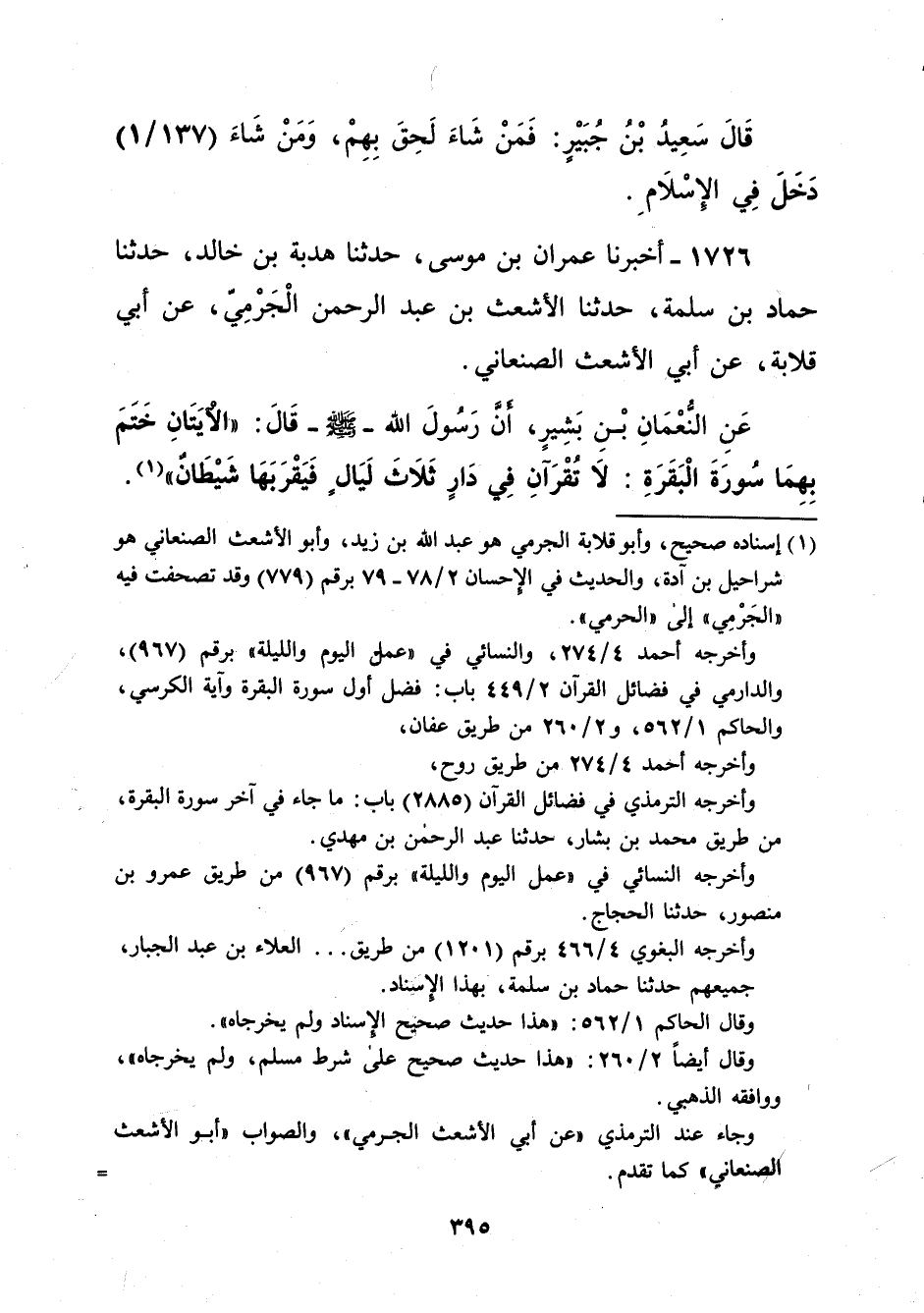 1726 - أخبرنا عمران بن موسى، حدثنا هدبة بن خالد، حدثنا حماد بن سلمة، حدثنا الأشعث بن عبد الرحمن الْجَرْمِيّ، عن أبي قلابة، عن أبي الأشعث الصنعاني. عَنِ النُّعْمَانِ بْنِ بَشِيبر، أنَّ رسول الله-صلى الله عليه وسلم-قَالَ: "الآيَتَانِ خَتَمَ بِهِمَا سُورَةَ الْبَقَرَةِ: لا تُقْرَآنِ فِي دَارٍ ثَلاثَ لَيَال فَيَقْرَبَهَا شَيْطَان" (¬1).