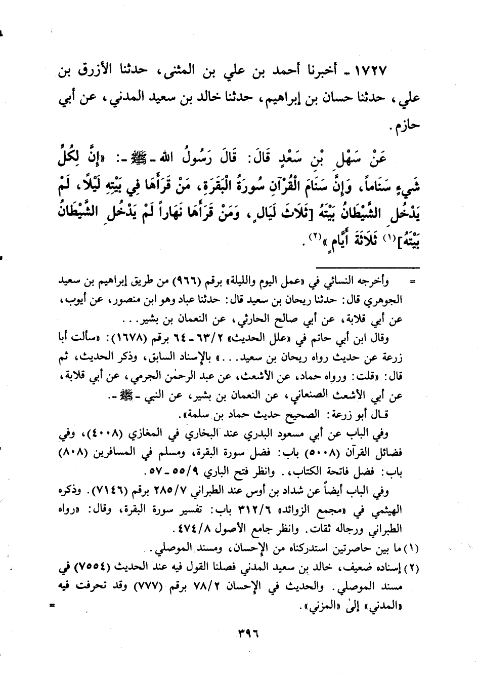 1727 - أخبرنا أحمد بن علي بن المثنى، حدثنا الأزرق بن علي، حدثنا حسان بن إبراهيم، حدثنا خالد بن سعيد المدني، عن أبي حازم. عَنْ سَهْلِ بْنِ سَعْدٍ قَالَ: قَالَ رَسُولُ الله -صلى الله عليه وسلم-:" إنَّ لِكُلِّ شَيءٍ سَنَاماً، وَإنَّ سَنَامَ الْقُرْآنِ سُورَةُ الْبَقَرَةِ، مَنْ قَرَأهَا فِي بَيْتِهِ لَيْلاً، لَمْ يَدْخُلِ الشيْطَانُ بَيْتَهُ [ثَلاثَ لَيَالٍ، وَمَنْ قَرَأهَا نَهَاراً لَمْ يَدْخُلِ الشَّيْطَانُ بَيْتَهُ] (¬1) ثَلاثَةَ أيَّامٍ" (¬2).