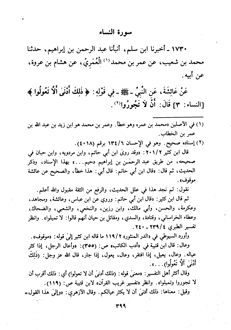 1730 - أخبرنا ابن سلم، أنبأنا عبد الرحمن بن إبراهيم، حدثنا، محمد بن شعيب، عن عمر بن محمد (¬1) الْعُمَرِيّ، عن هشام بن عروة، عن أبيه. عَنْ عَائِشَةَ، عَنِ النَّبِيِّ -صلى الله عليه وسلم- فِي قَوْلهِ: {ذَلِكَ أَدْنَى أَلَّا تَعُولُوا} [النساء: 3] قَالَ: أنْ لاَ تَجُورُوا (¬2).