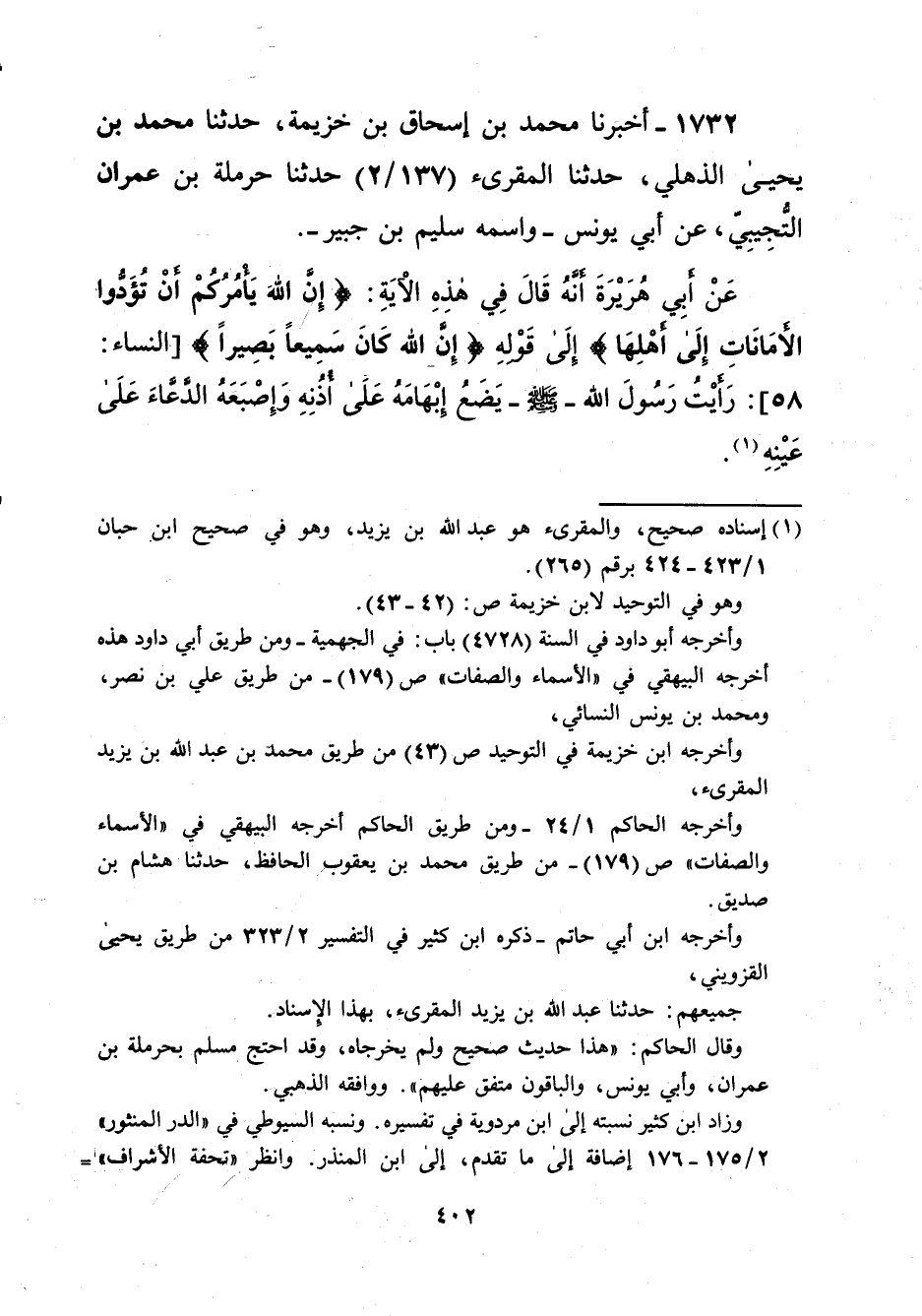 1732 - أخبرنا محمد بن إسحاق بن خزيمة، حدثنا محمد بن يحيى الذهلي، حدثنا المقرئ (2/ 137) حدثنا حرملة بن عمران التُّجِيبيّ، عن أبي يونس- واسمه سليم بن جبير-. عَنْ أبِي هُرَيْرَةَ أنَّهُ قَالَ فِي هذِهِ الأيَةِ: {إِنَّ اللَّهَ يَأْمُرُكُمْ أَنْ تُؤَدُّوا الْأَمَانَاتِ إِلَى أَهْلِهَا} إلَى قوله {إِنَّ اللَّهَ كَانَ سَمِيعًا بَصِيرًا} [النساء: 58]: رَأيْتُ رسول الله -صلى الله عليه وسلم-يَضَعُ إبْهَامَهُ عَلَى أُذُنِهِ وَإِصْبَعَهُ الدَّعَّاء عَلَى عَيْنِهِ (¬1).