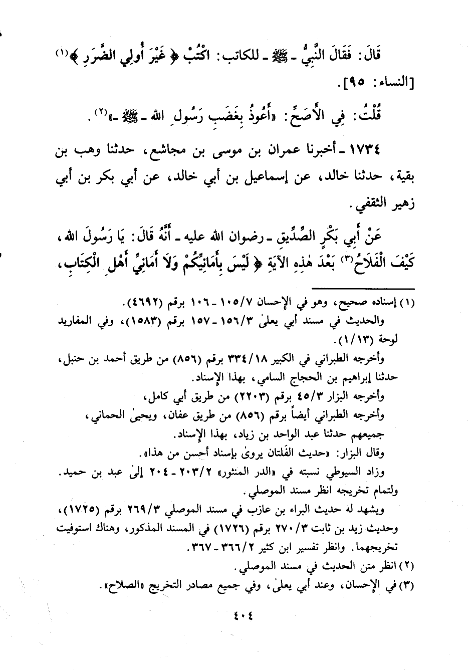 ويشهد له حديث البراء بن عازب في مسند الموصلي 3/ 269 برقم (1725)، وحديث زيد بن ثابت 3/ 270 برقم (1726) في المسند المذكور، وهناك استوفيت تخريجهما. وانظر تفسير ابن كثير 2/ 366 - 367.