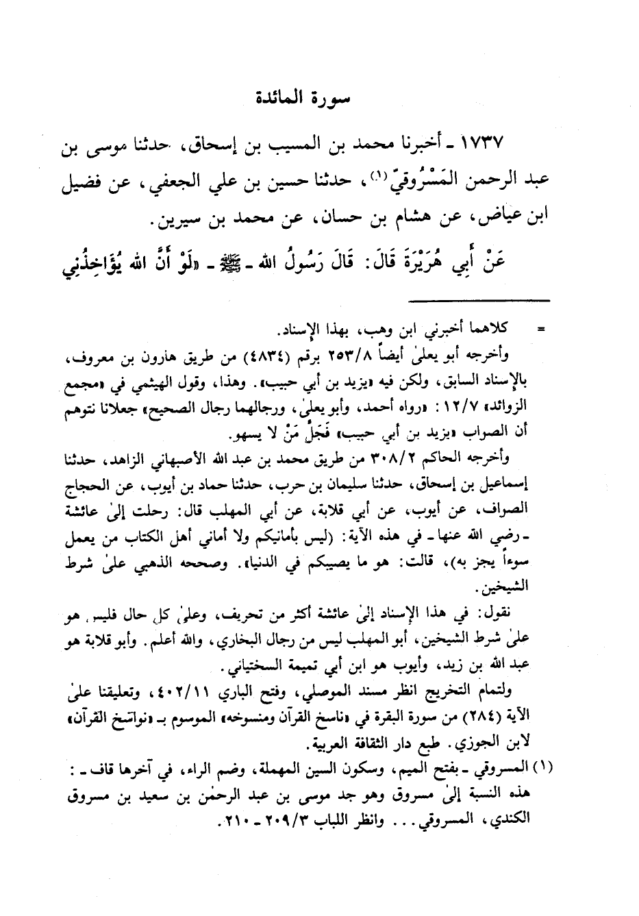 1737 - أخبرنا محمد بن المسيب بن إسحاق، حدثنا موسى بن عبد الرحمن الْمَسْرُوقيّ (¬1)، حدثنا حسين بن علي الجعفي، عن فضيل ابن عياض، عن هشام بن حسان، عن محمد بن سيرين. عَنْ أبِي هرَيْرَةَ قَالَ: قَالَ رَسُولُ الله -صلى الله عليه وسلم- "لَوْ أنَّ الله يُؤاخِذُنِي