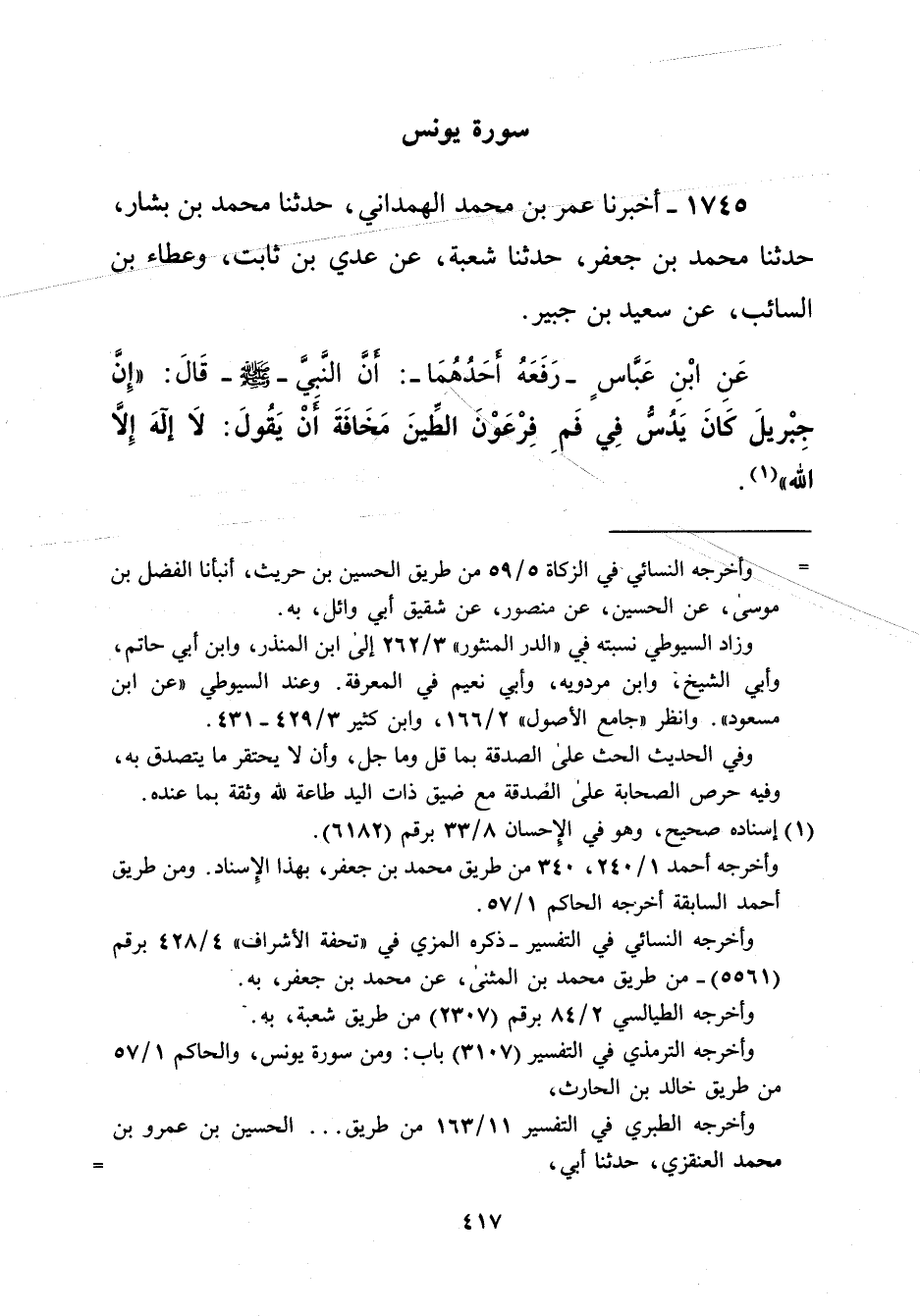 1745 - أخبرنا عمر بن محمد الهمداني، حدثنا محمد بن بشار، حدثنا محمد بن جعفر، حدثنا شعبة، عن عدي بن ثابت، وعطاء بن السائب، عن سعيد بن جبير. عَنِ ابْنِ عَبَّاسٍ- رَفَعَهُ أحَدُهُمَا-: أنَّ النَّبيَّ -صلى الله عليه وسلم- قَالَ: "إِنَّ جِبْريلَ كَانَ يَدُسُّ فِي فَمِ فِرْعَوْن الطِّينَ مَخَافَةَ أَنْ يَقُولَ: لا إله إِلاَ الله" (¬1).