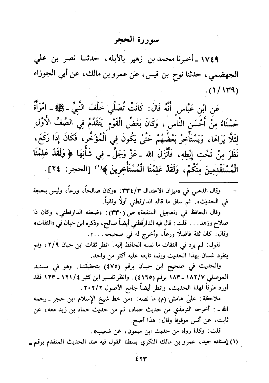 1749 - أخبرنا محمد بن زهير بالأبله، حدثنا نصر بن علي الجهضمي، حدثنا نوح بن قيس، عن عمرو بن مالك، عن أبي الجوزاء (139/ 1). عَنِ ابْنِ عَباسٍ أنَّهُ قَالَ: كَانَتْ تُصَلِّيَ خَلفَ النَّبِيِّ -صلى الله عليه وسلم- امْرأةٌ حَسْنَاءُ مِنْ أَحْسَنِ النَّاسِ، وَكَانَ بَعْضُ الْقَوْمِ يتقدَّمُ فِي الصَّفِّ الأوَّلِ لِئَلاَّ يَرَاهَا، وَيسْتأْخِرُ بَعْضُهُمْ حَتَّى يَكُونَ فِي الْمُؤَخَّر، فَكَانَ إِذَا رَكَعَ، نَظَرَمِنْ تَحْتِ إِبْطِهِ، فَأنْزَلَ الله- عَزَّ وَجَلَّ- فِي شَأْنِهَا {وَلَقَدْ عَلِمْنَا الْمُسْتَقْدِمِينَ مِنْكُمْ وَلَقَدْ عَلِمْنَا الْمُسْتَأْخِرِينَ} (¬1) [الحجر: 24].