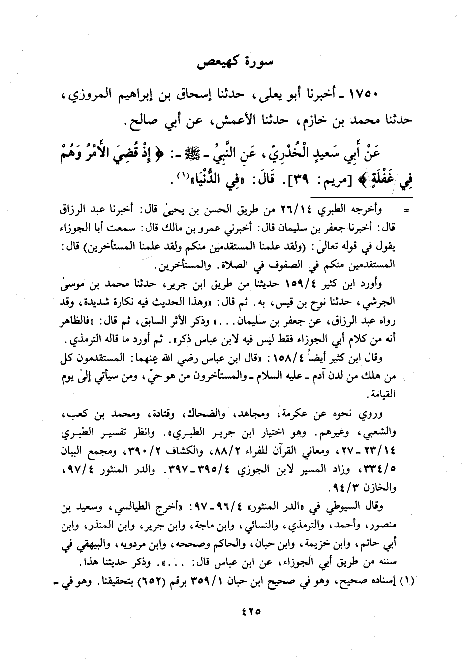 1750 - أخبرنا أبو يعلى، حدثنا إسحاق بن إبراهيم المروزي، ثنا محمد بن خازم، حدثنا الأعمش، عن أبي صالح. عَنْ أبِي سَعيدٍ الْخُدْرِيّ، عَنِ النَّبِيِّ -صلى الله عليه وسلم-: (إذْ قُضِيَ الأمْرُ وَهُمْ فى غَفْلَةٍ) [مريم: 39]. قَالَ:"فَي الدُّنْيَا" (¬1).