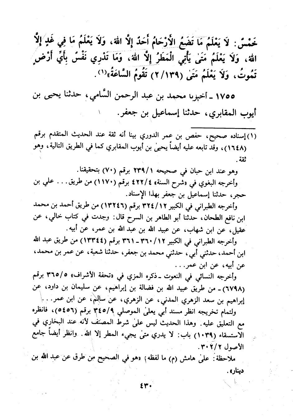 خَمْسٌ: لا يَعْلَمُ مَا تَضَعُ الأرْحَامُ أحدٌ إلاَّ الله، وَلا يَعْلَمُ مَا فِي غدٍ إلاَّ الله، وَلا يَعْلَمُ مَتَى يَأْتِي الْمَطَرُ إِلاَّ اللهُ، وَمَا تَدْرِي نَفْسٌ بِأَيِّ أَرْض تَمُوتُ، وَلا يَعْلَمُ مَتَى (139/ 2) تَقُومُ الساعَةُ" (¬1).