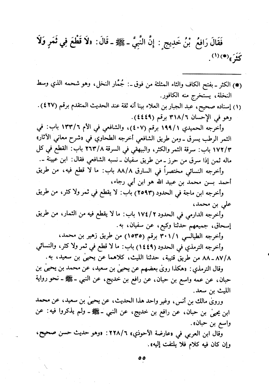 فَقَالَ رَافعُ بْنُ خَدِيجٍ: إِنَّ النَّبِيَّ -صلى الله عليه وسلم- قَالَ: "لا قَطْعَ فى ثَمَرٍ وَلا كثر" (*) (¬1).