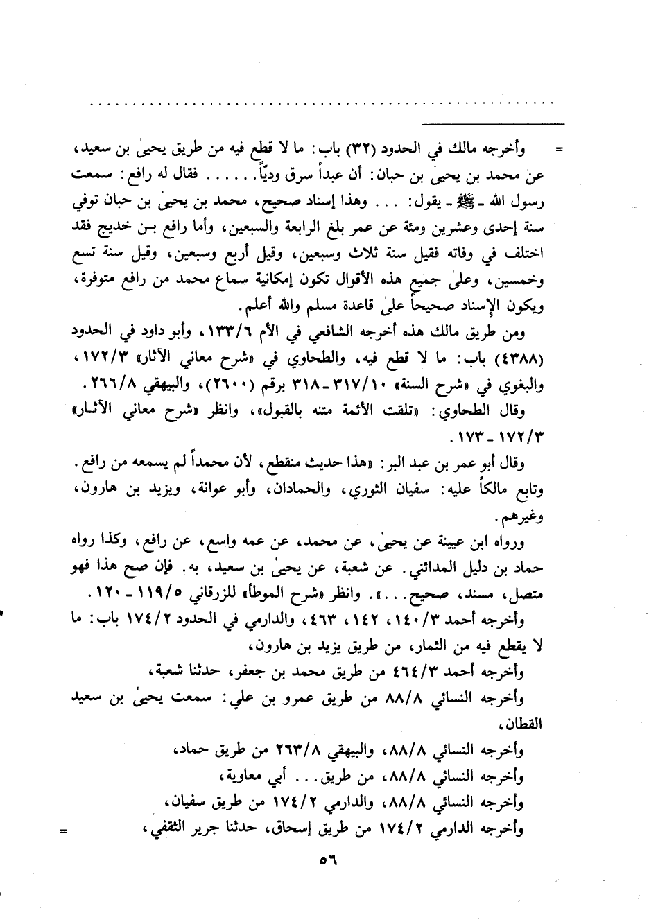 = وأخرجه مالك في الحدود (32) باب: ما لا قطِع فيه من طريق يحيى بن سعيد، عن محمد بن يحيى بن حبان: أن عبداً سرق وديًّا ...... فقال له رافع: سمعت رسول الله -صلى الله عليه وسلم-يقول: ... وهذا إسناد صحيح، محمد بن يحيى بن حبان توفي سنة إحدى وعشرين ومئة عن عمر بلغ الرابعة والسبعين، وأما رافع بن خديج فقد اختلف في وفاته فقيل سنة ثلاث وسبعين، وقيل أربع وسبعين، وقيل سنة تسع وخمسين، وعلى جميع هذه الأقوال تكون إمكانية سماع محمد من رافع متوفرة، ويكون الإسناد صحيحا على قاعدة مسلم والله أعلم.