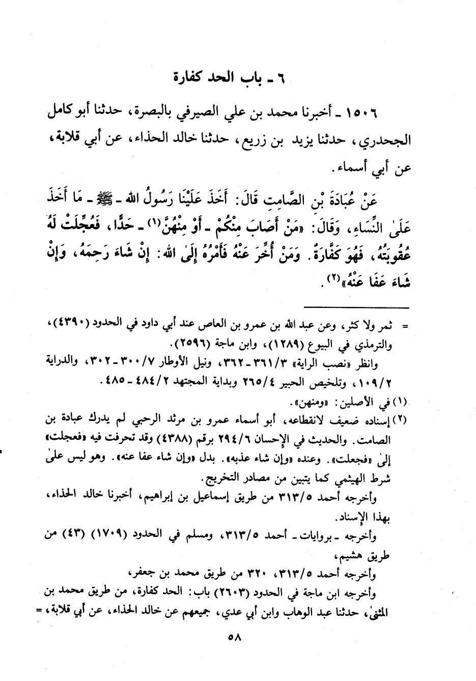 وأخرجه- بروايات- أحمد 5/ 313، ومسلم في الحدود (1709) (43) من طريق هشيم، وأخرجه أحمد 5/ 313، 320 من طريق محمد بن جعفر، وأخرجه ابن ماجة في الحدود (2603) باب: الحد كفارة، من طريق محمد بن المثنى، حدثنا عبد الوهاب وابن أبي عدي، جميعهم عن خالد الحذاء، عن أبي قلابة، =